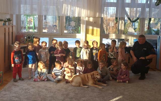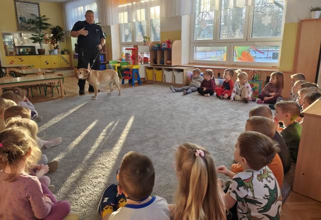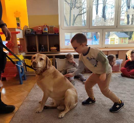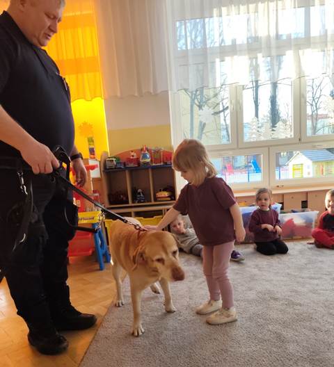 Dzisiaj w naszej grupie gościliśmy bardzo zgrany duet- przedstawiciela sekcji Animal Patrolu, który na co dzień zajmuje się pomocą zwierzętom w potrzebie wraz z jego czworonożnym przyjacielem - psem. Uczyliśmy się nie tylko jak zachowywać się w obecności nieznanych zwierząt, ale również co należy zrobić gdy chcemy pogłaskać obcego psa.