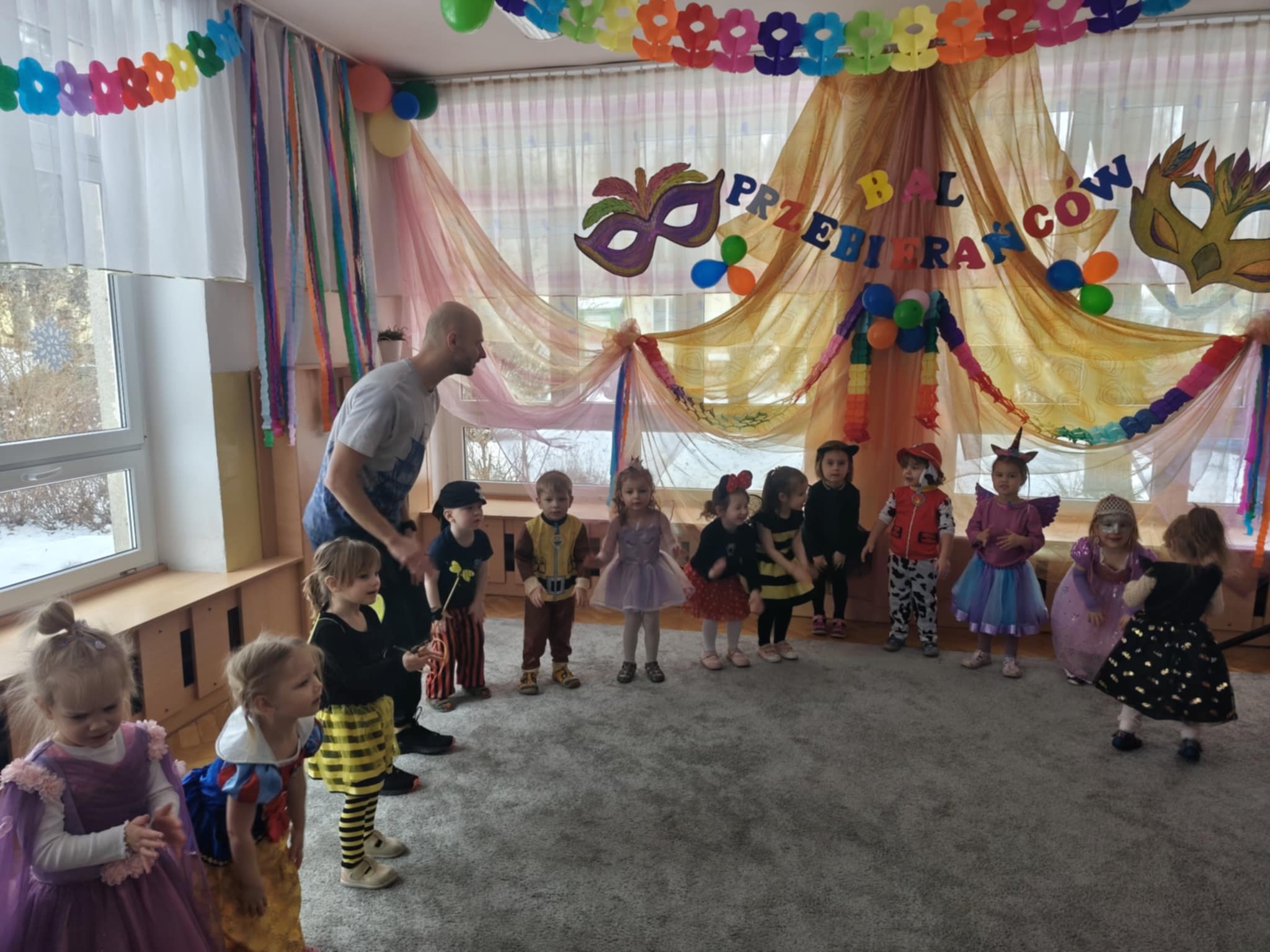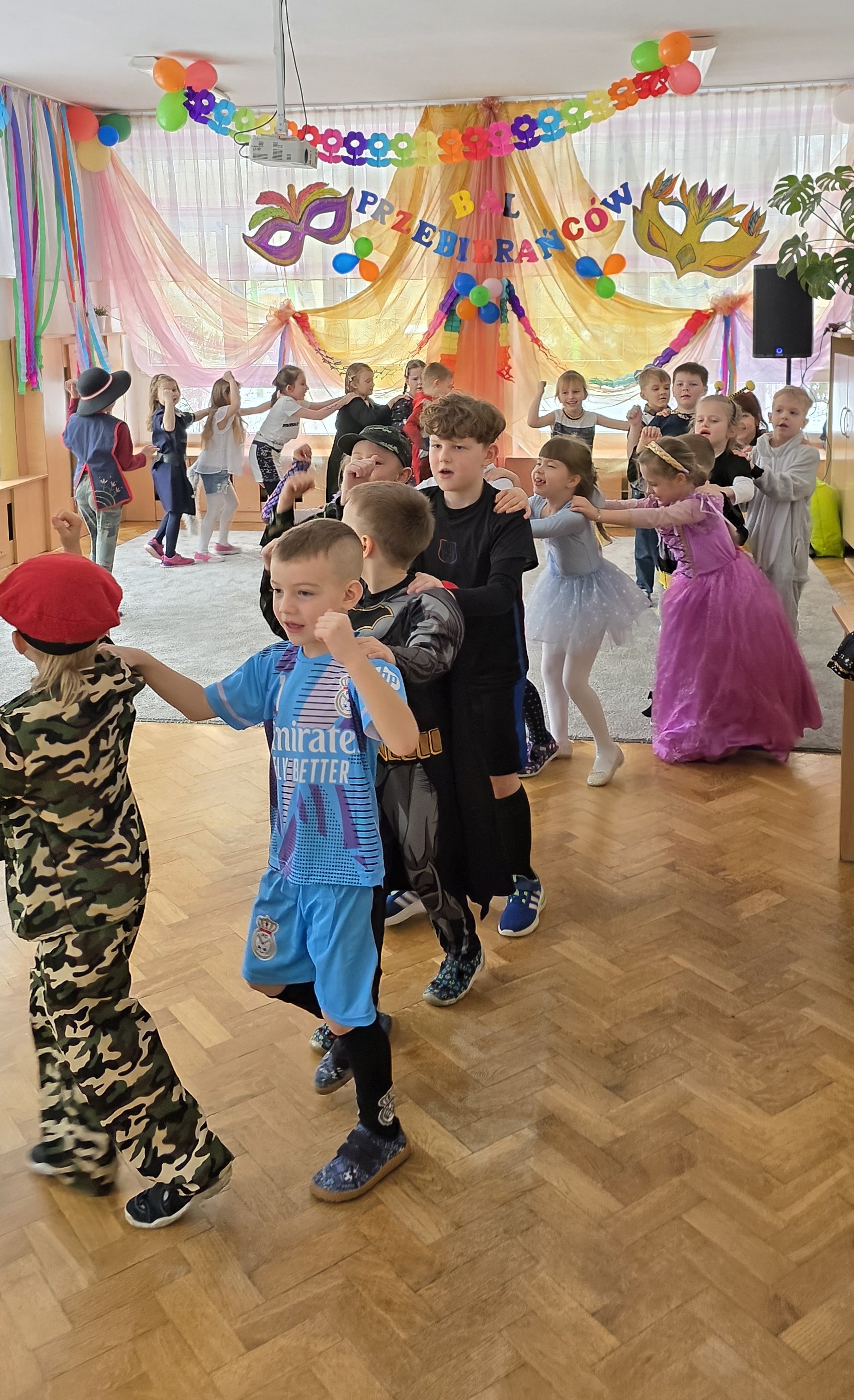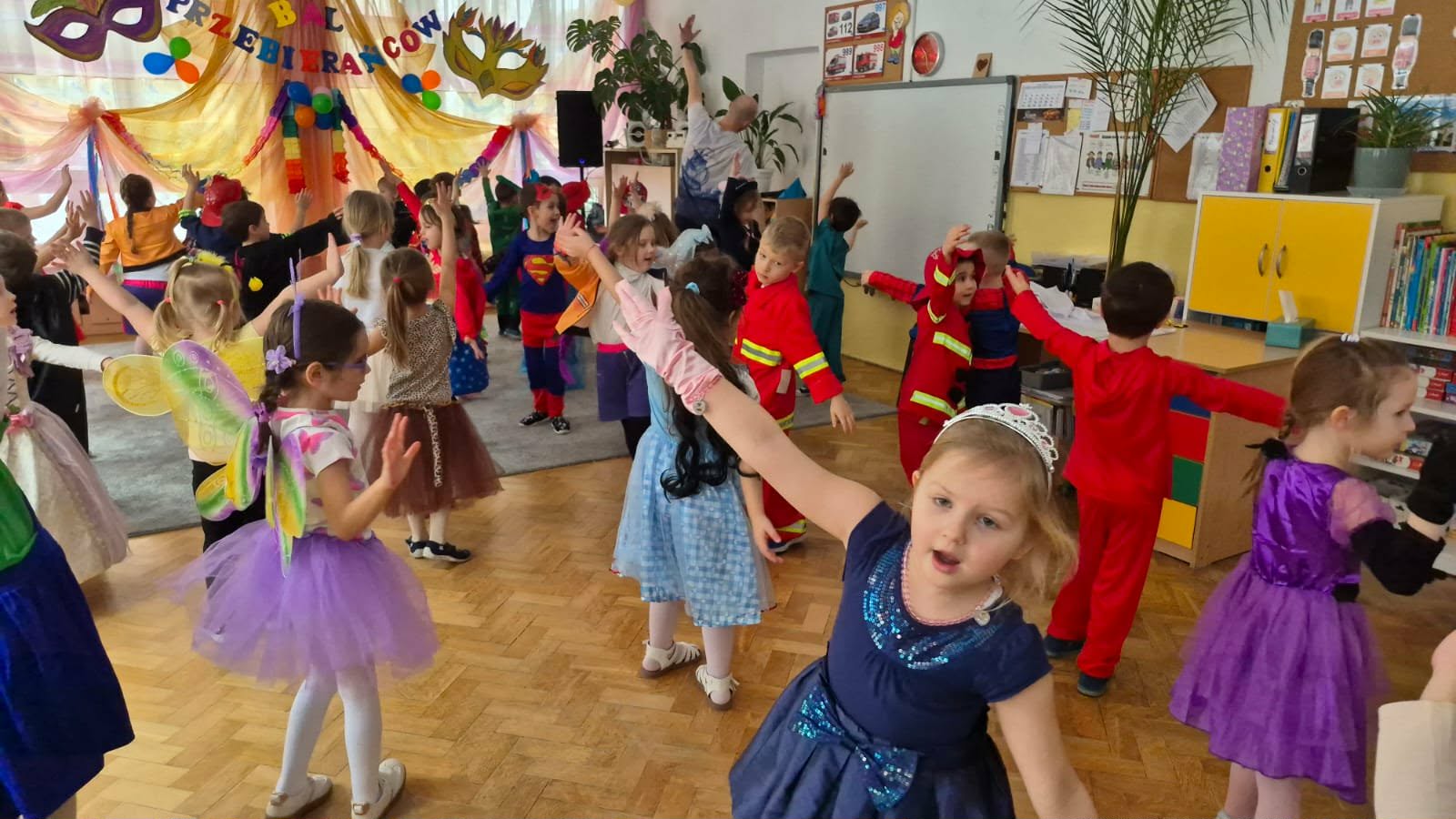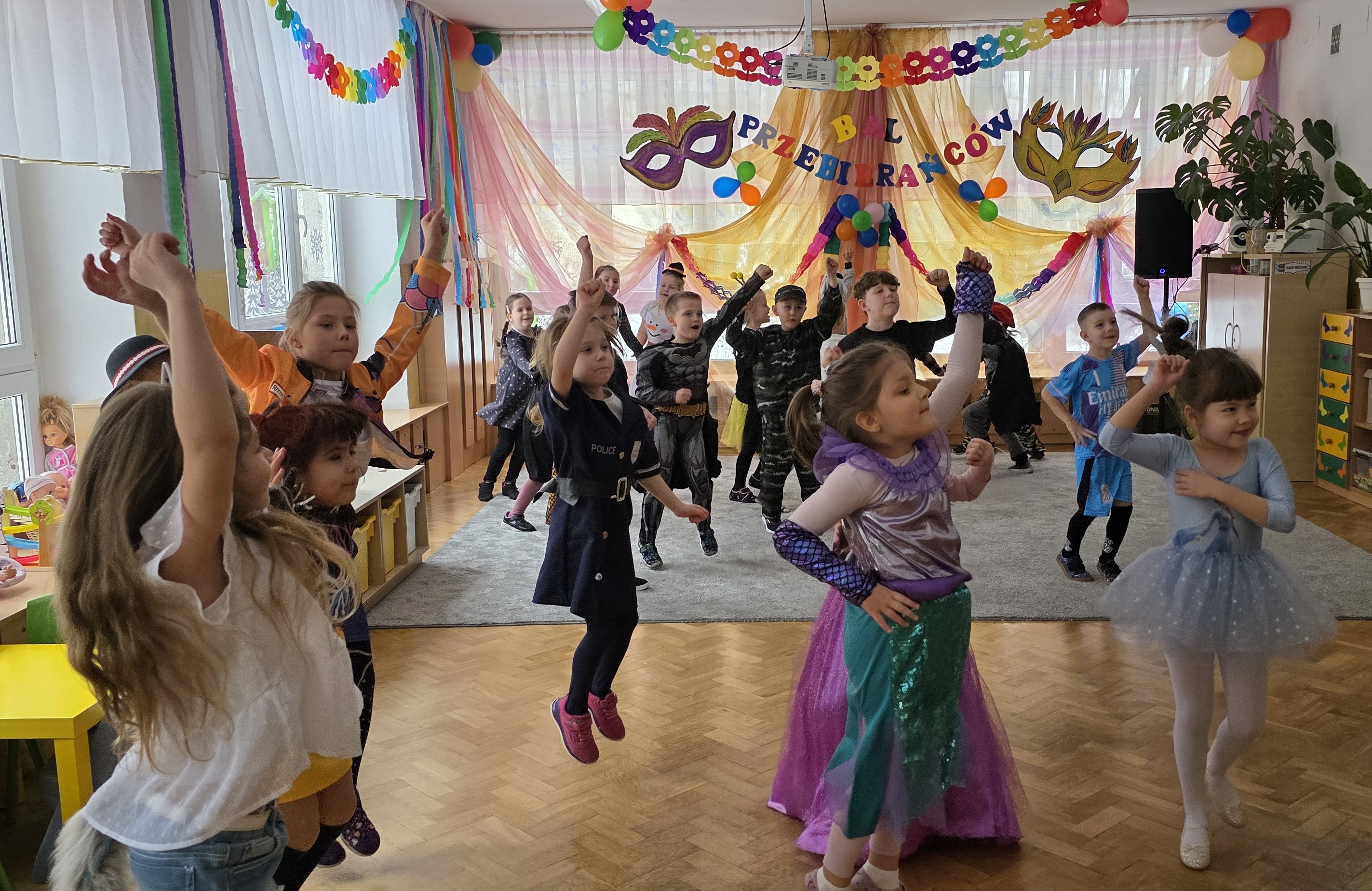 Karnawał to czas zabaw i balów, także dla najmłodszych. Kolorowe stroje, bajeczny wystrój i skoczna muzyka - w takiej atmosferze bawiły się wszystkie dzieci w naszym przedszkolu podczas balu karnawałowego. Tego dnia już od rana w przedszkolu pojawiały się kolorowe postacie - wróżki, księżniczki, motylki, piraci, policjanci, a rozpoznać dzieci było bardzo trudno. Wszyscy świetnie bawili się, uczestnicząc we wspólnych zabawach, a skoczna i rytmiczna muzyka zachęcała do tańca.
