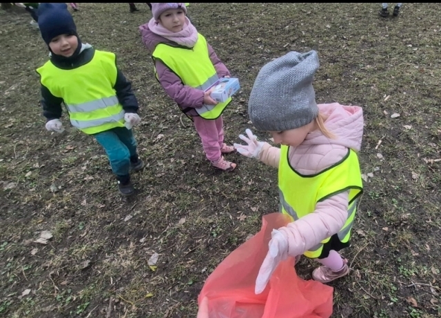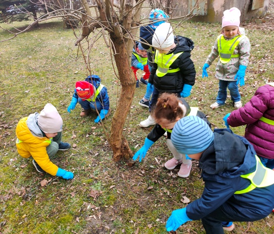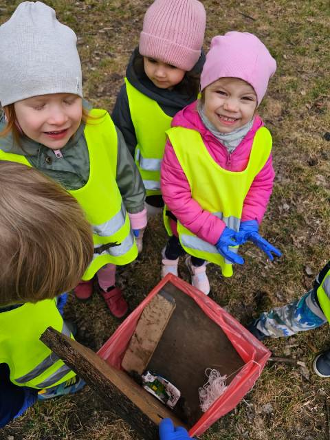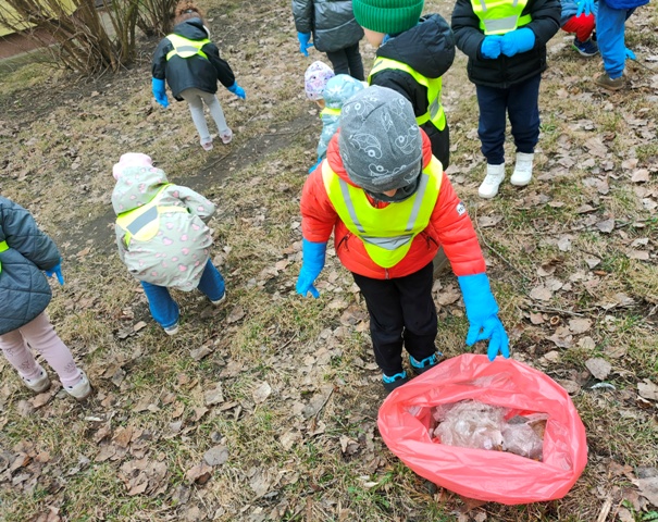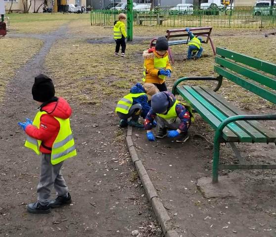 Zaraz po śniadaniu, wyposażeni w jednorazowe rękawiczki i czerwone worki na śmieci ruszyliśmy sprzątać teren wokół naszego drugiego domu - przedszkola. Niestety, okazało się że ustępująca zima odkryła wiele "skarbów" pozostawionych przez mieszkańców naszego osiedla. Znów ręce mieliśmy pełne roboty - nasze worki wypełniły się opakowaniami plastikowymi, papierami... - można by jeszcze dużo wyliczać. Dzięki naszej pracy wiosnę powitamy czystymi skwerami i pobliskimi trawnikami.