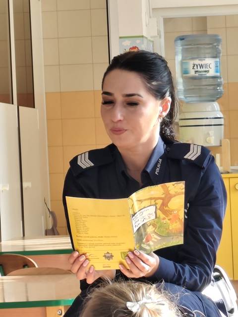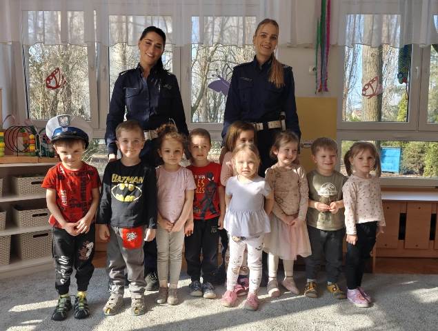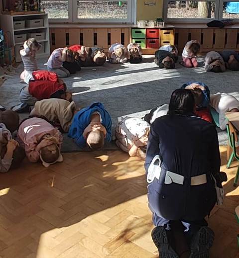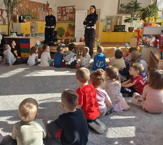 Spotkanie z policjantkami było okazją do poznania zasad bezpiecznego poruszania się po ulicy, zachowania w sytuacjach dla nas niebezpiecznych- gdy zostaniemy zaczepieni przez obcą osobę, lub gdy się zgubimy. Uczyliśmy się również jak należy zachować się podczas spotkania z obcym, groźnym zwierzęciem- psem.