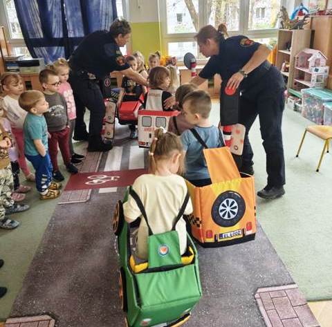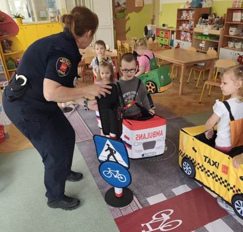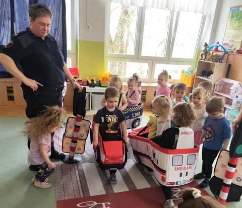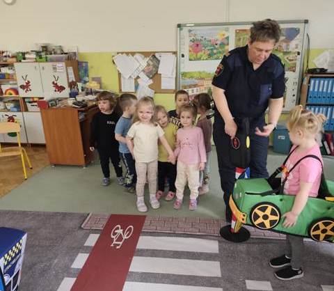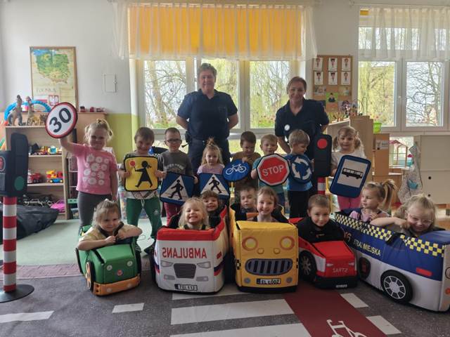 Oj działo się dzisiaj w naszym przedszkolu. W klasie słychać było nie tylko dziecięcy śmiech, rozmowy, ale również warkot silników samochodowych- wszystko za sprawą przedstawicieli Straży Miejskiej, którzy pozwolili Nam choć na chwilę stać się prawdziwymi kierowcami.