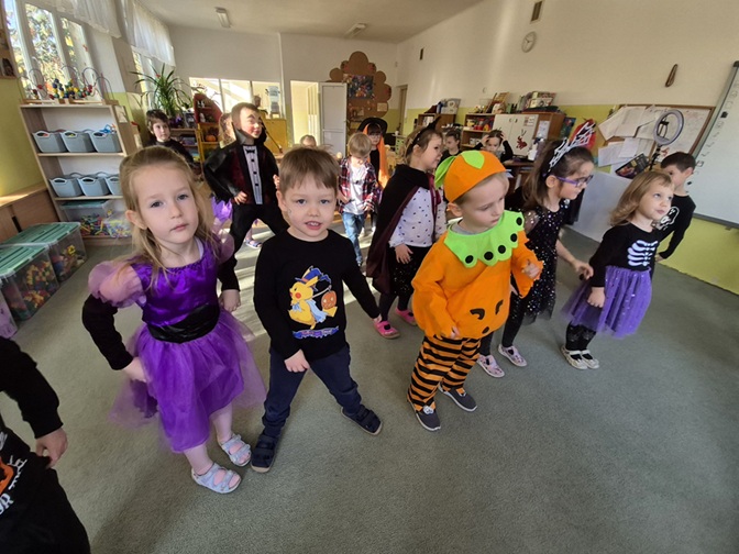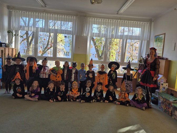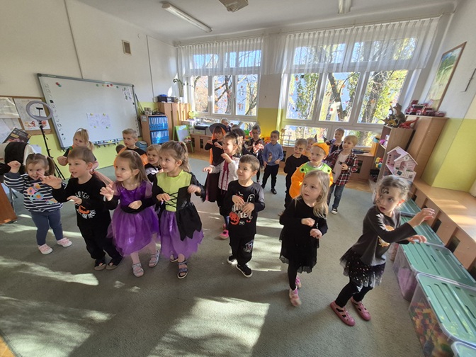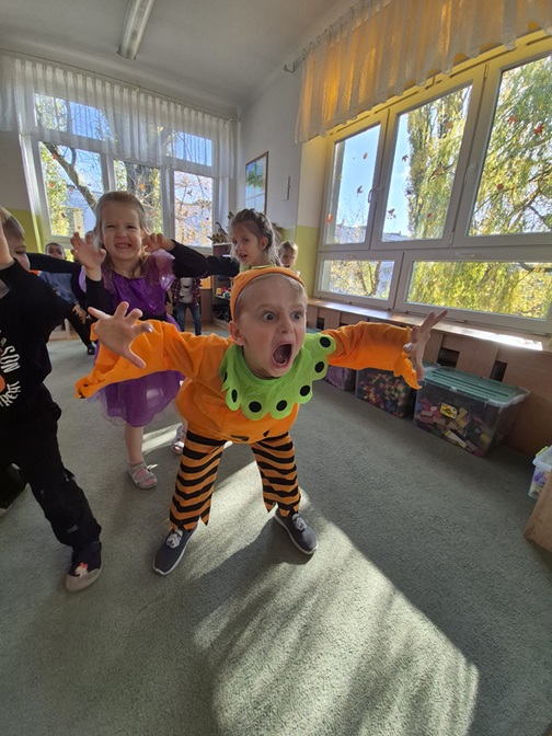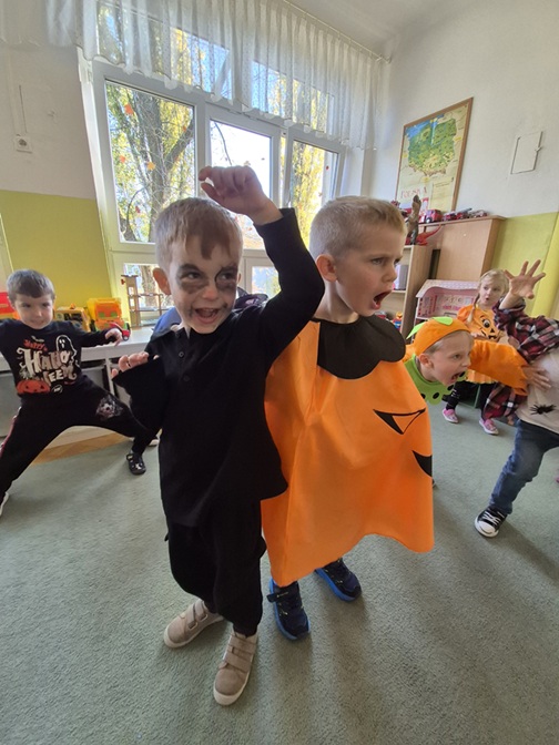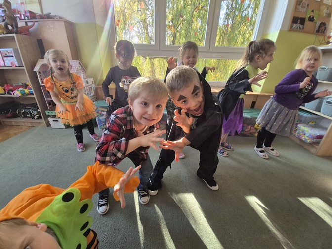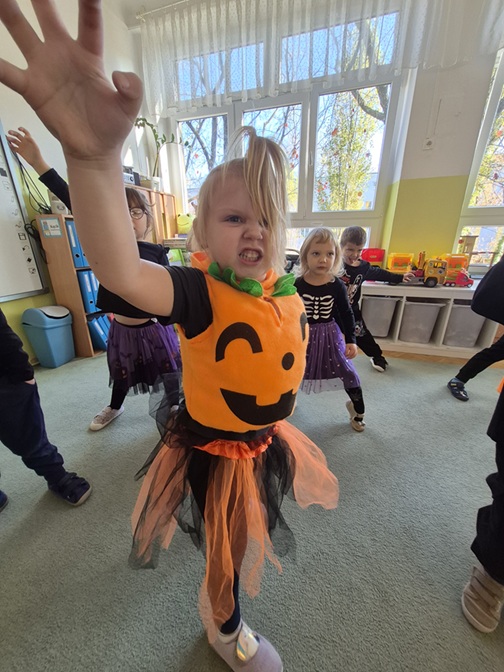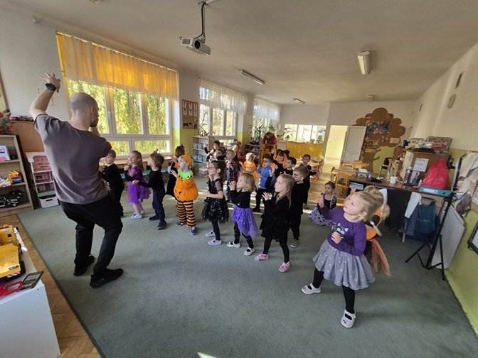 Dzień rozpoczęliśmy rozmową na temat tradycji Halloween – dzieci dowiedziały się, skąd pochodzi to święto, jak wygląda jego obchodzenie w innych krajach oraz jakie zwyczaje z nim się wiążą. Następnie przedszkolaki zaprezentowały swoje fantazyjne przebrania – wśród nich można było zobaczyć czarodziejki, dynie, duchy, nietoperze i wesołe potworki. Nie zabrakło także zabaw tanecznych przy muzyce z wujkiem Darkiem.