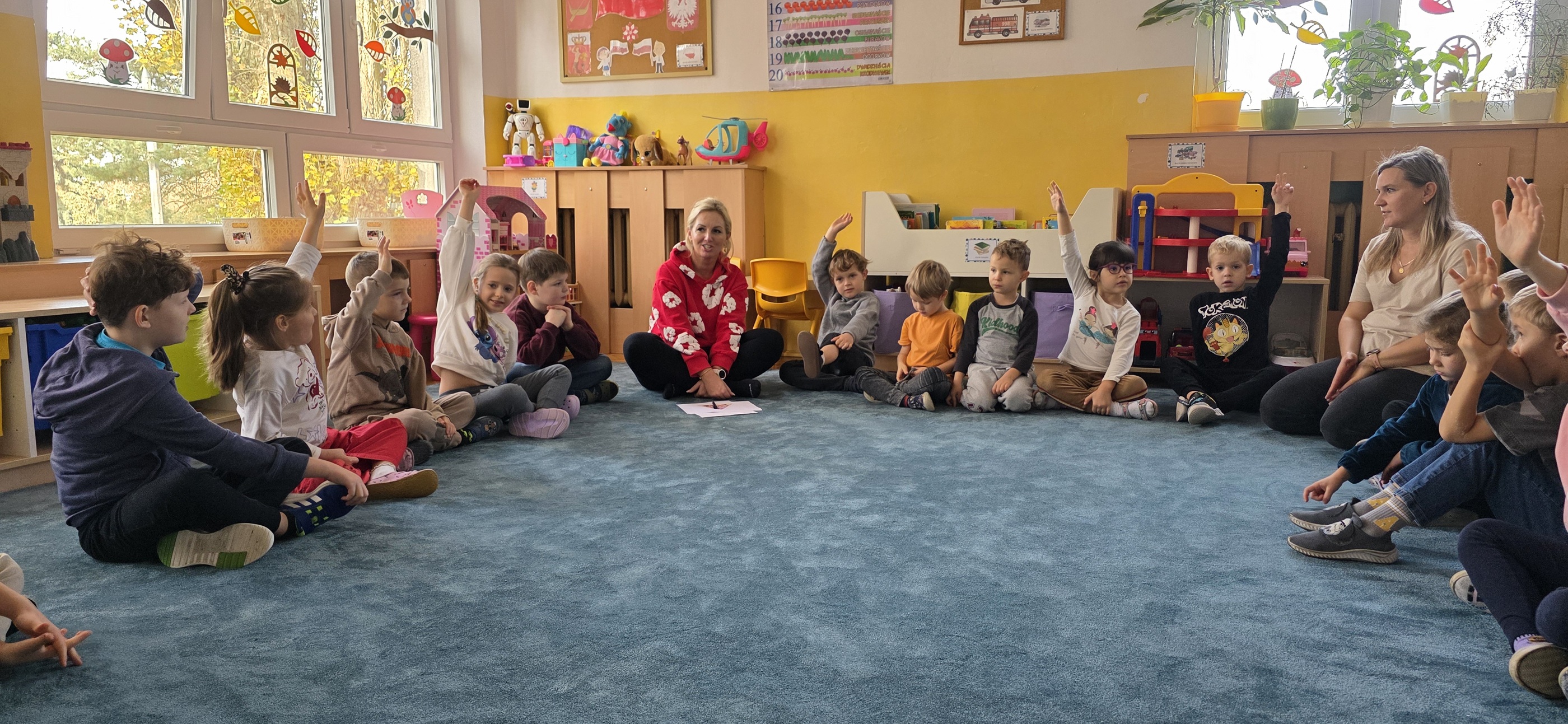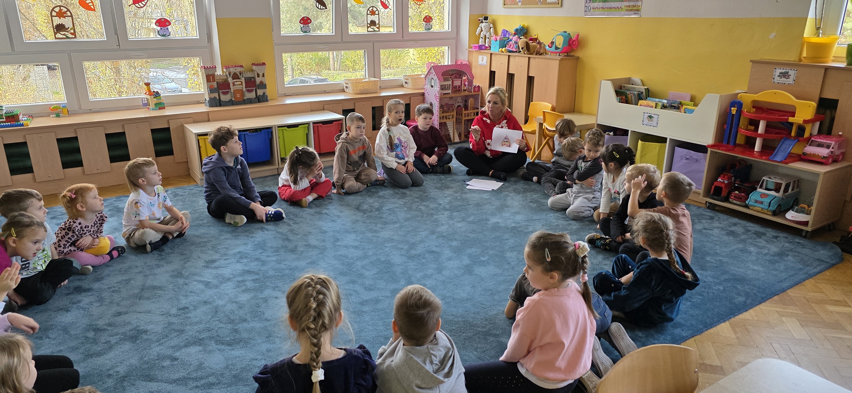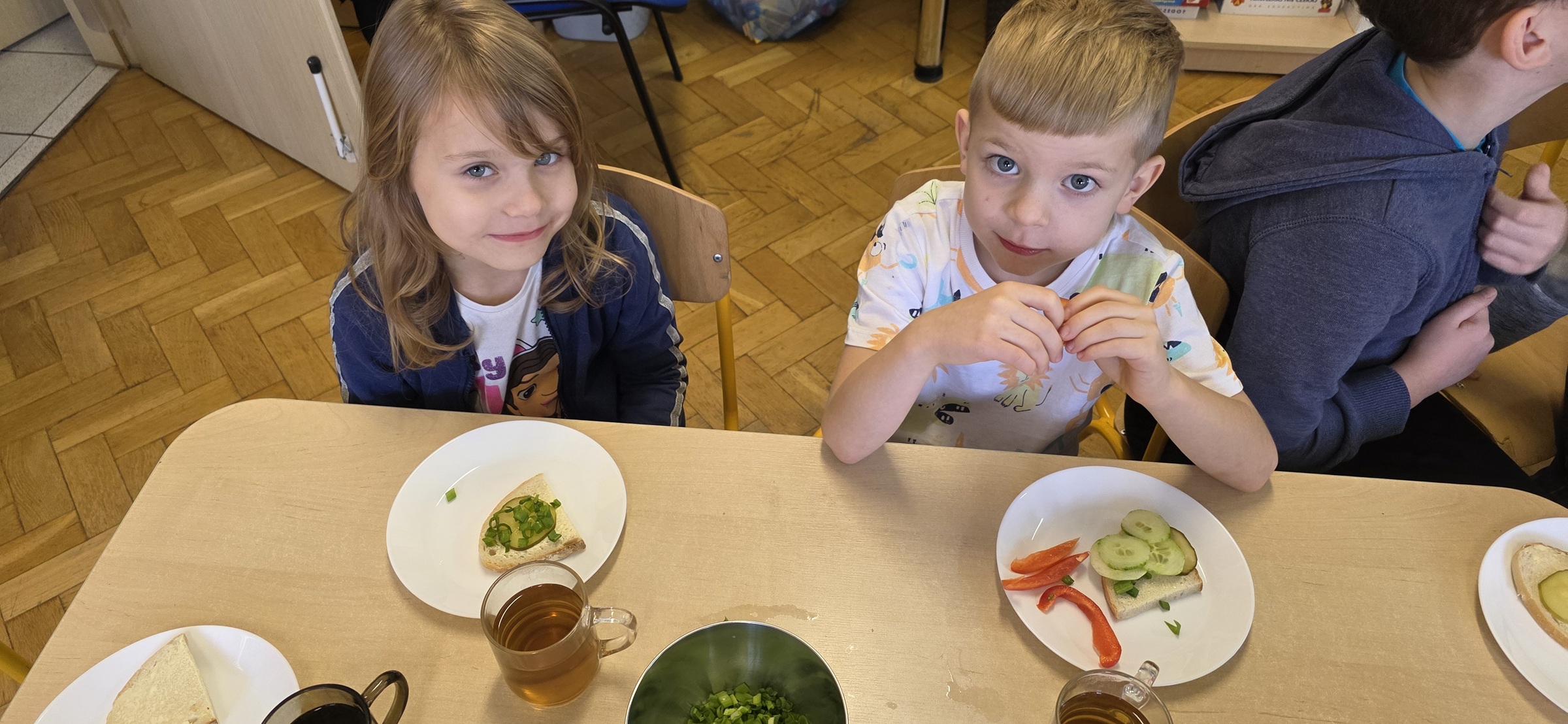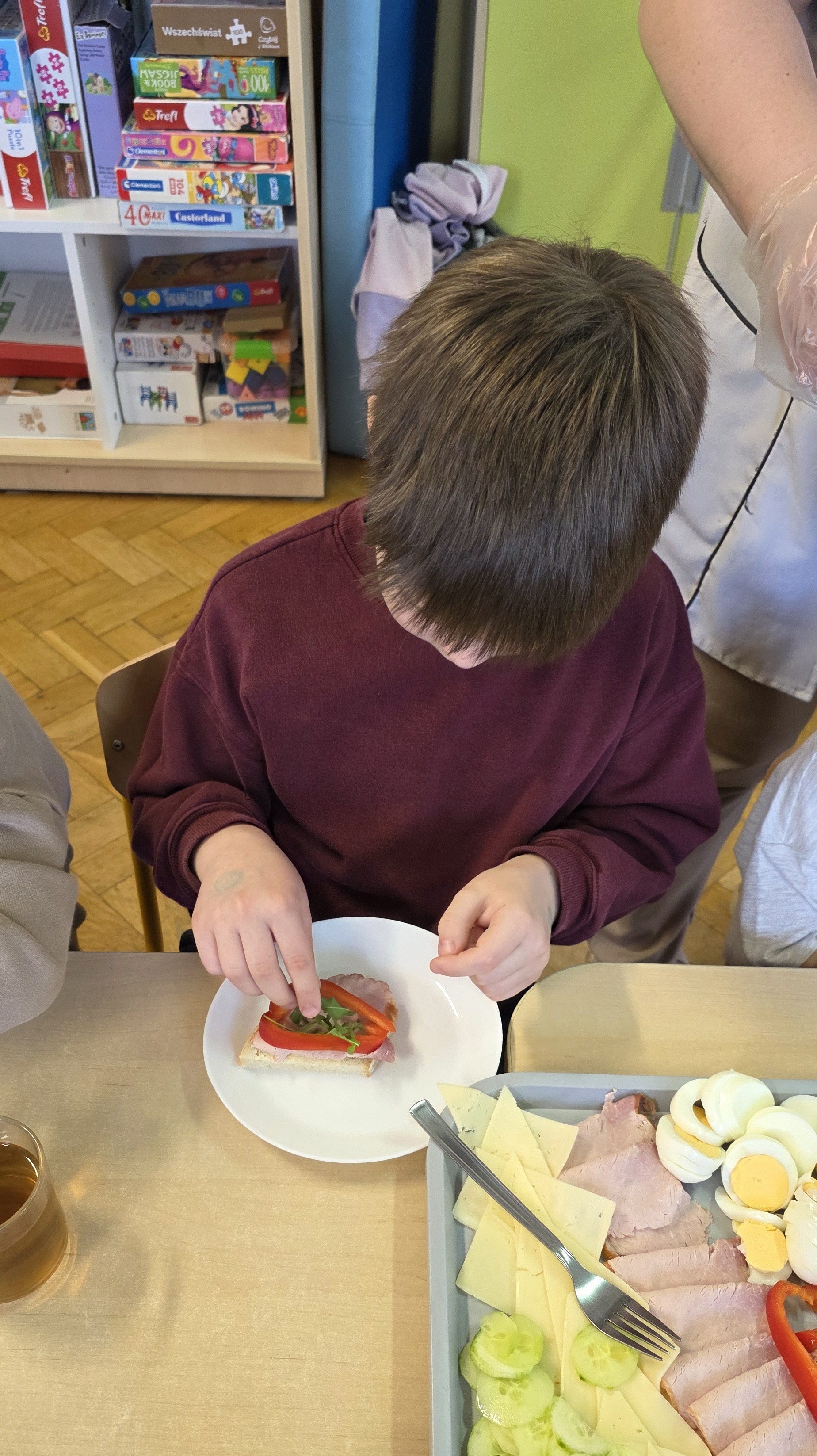 W ramach realizacji projektu "Kuchenne rewolucje..." odwiedziła nas nasza Ciocia Ela, czyli specjalistka od spraw organizacyjno-żywieniowych w przedszkolu. Opowiedziała o swojej pracy, planowaniu zdrowego żywienia dla dzieci i zaplanowała wspólnie z nami jadłospis na następny tydzień. Ponadto dzisiaj śniadanie odbyło się w formie „szwedzkiego stołu”, podczas którego naszym zadaniem było przygotowanie kolorowych kanapeczek z jak największą ilością warzyw.
