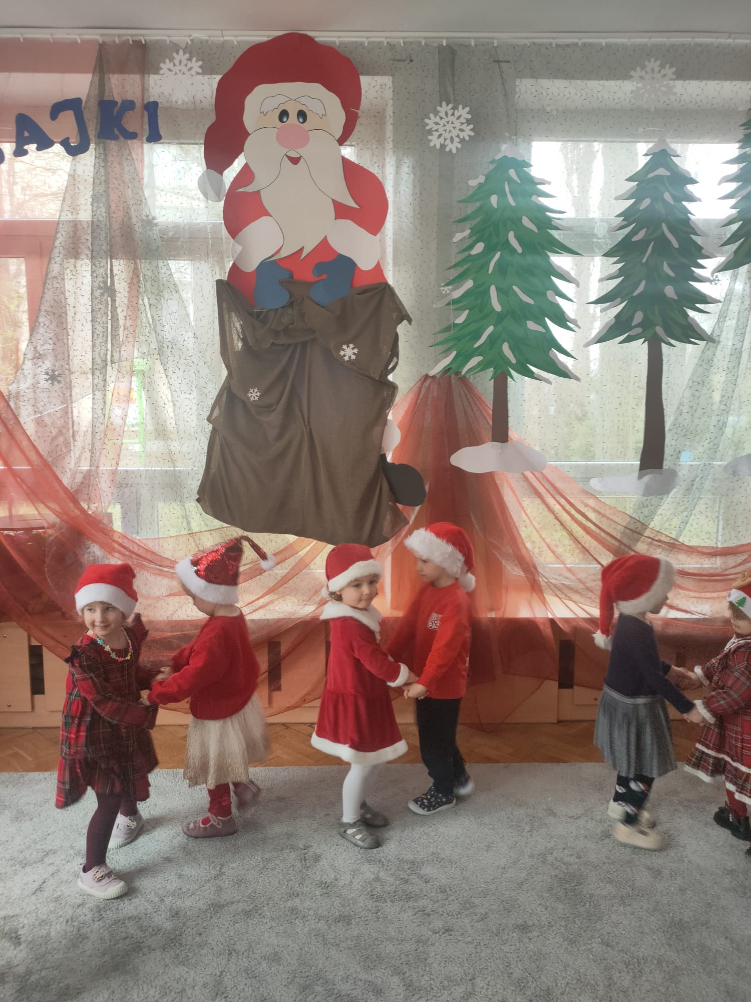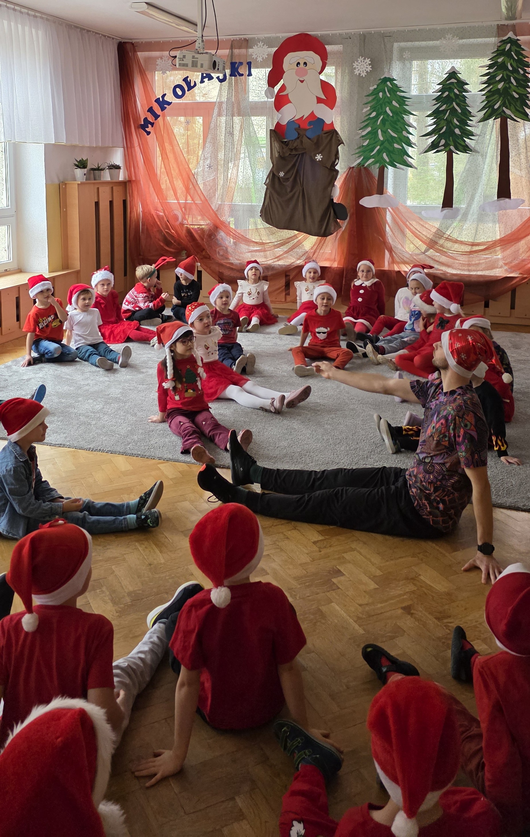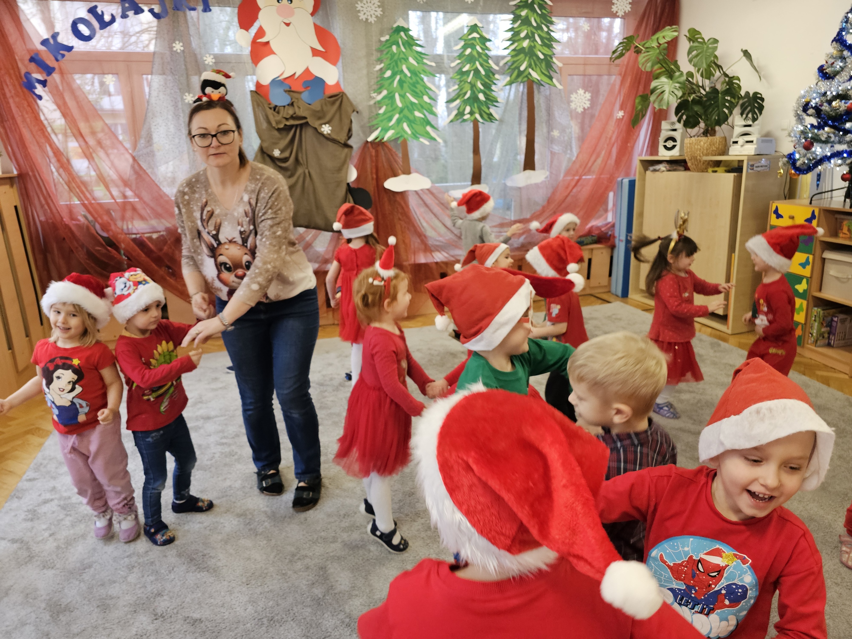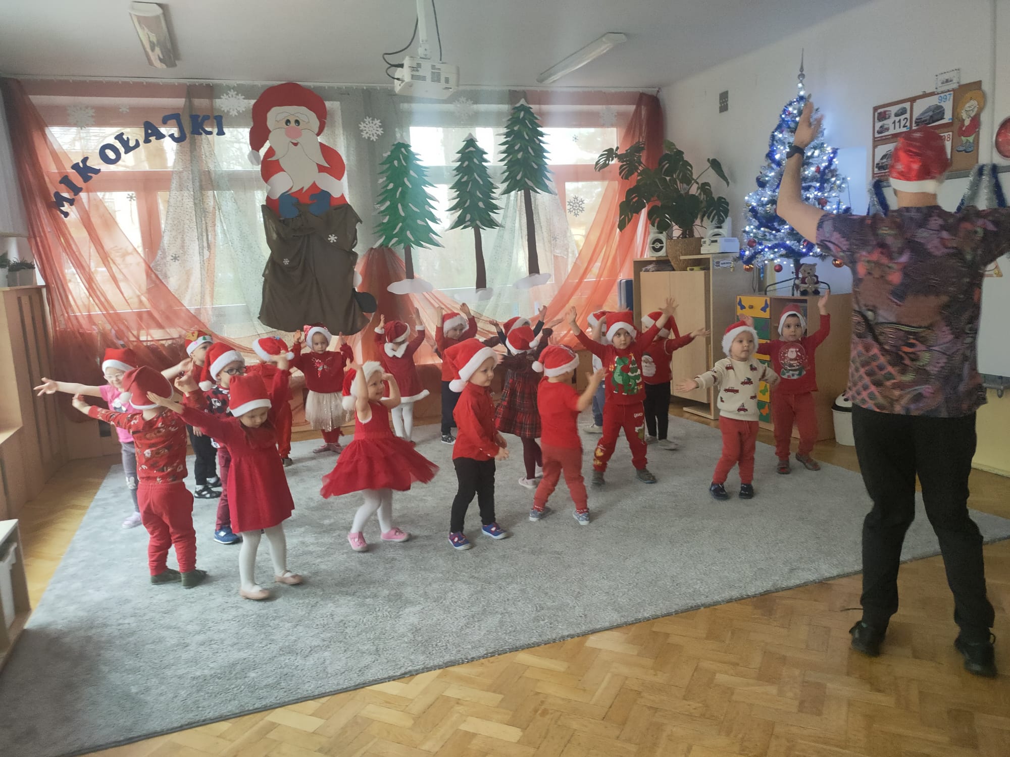 Zgodnie z tradycją 5 grudnia uroczyście obchodziliśmy w przedszkolu mikołajkowe święto. W tym dniu wszystkie dzieci zamieniły się w pomocników Mikołaja i przyszły do przedszkola w czerwonych strojach lub mikołajkowych czapeczkach. Radości nie było końca - wspólnie z Panem Darkiem bawiliśmy się przy ulubionych piosenkach z repertuaru zimowo-świątecznego. Zwieńczeniem tego radosnego dnia były drobne upominki.