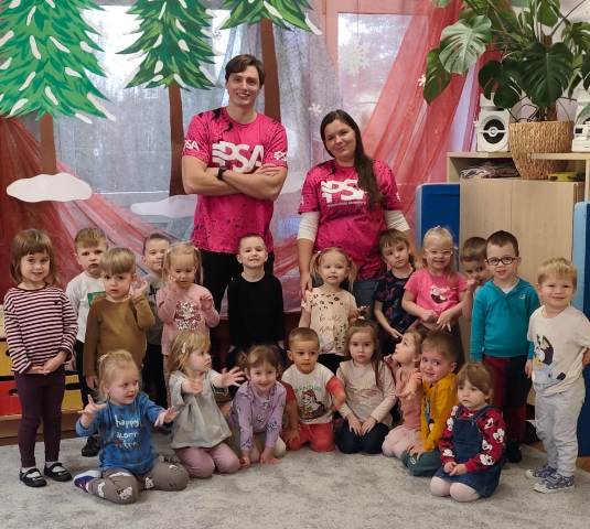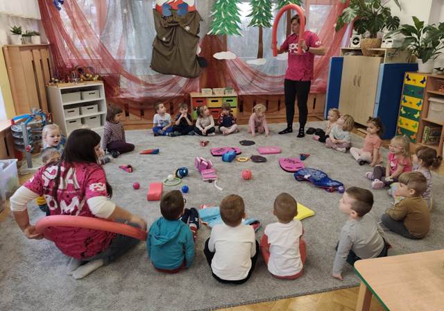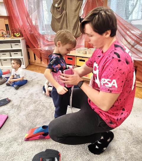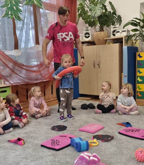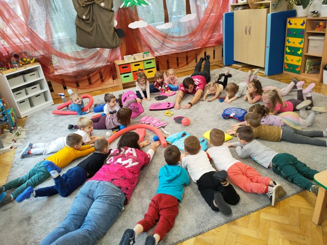 Dzisiaj nasz przedszkolny dywan zamieniony został w wielki basen. Tu pod czujnym okiem trenerów uczyliśmy się "na sucho" pływać stylem grzbietowym, kraulem i żabką. Poznaliśmy także różne akcesoria pływackie ułatwiające naukę pływania. A teraz może już czas przenieść naukę pływania na prawdziwą pływalnię- wszystko zależy od Was kochani Rodzice.