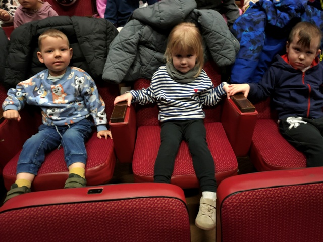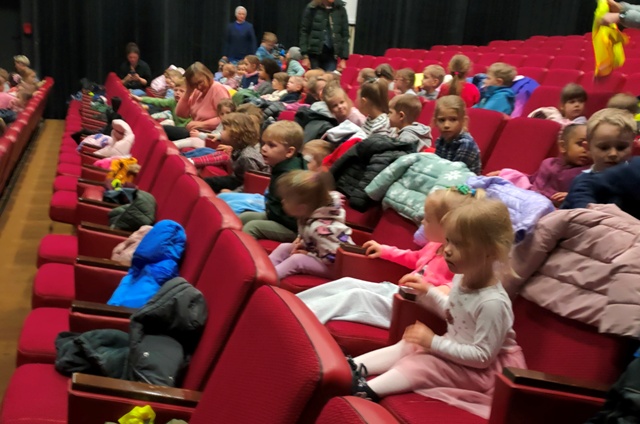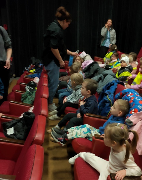 Trochę niepewnie przekroczyliśmy progi teatru - ile tam było dzieci z różnych przedszkoli. Pod czujnym okiem naszych cioć bezpiecznie dotarliśmy na widownię, gdzie zajęliśmy wyznaczone dla Nas miejsca. Nagle... światło zaczęło przygasać, a do naszych uszu dobiegła piękna muzyka.