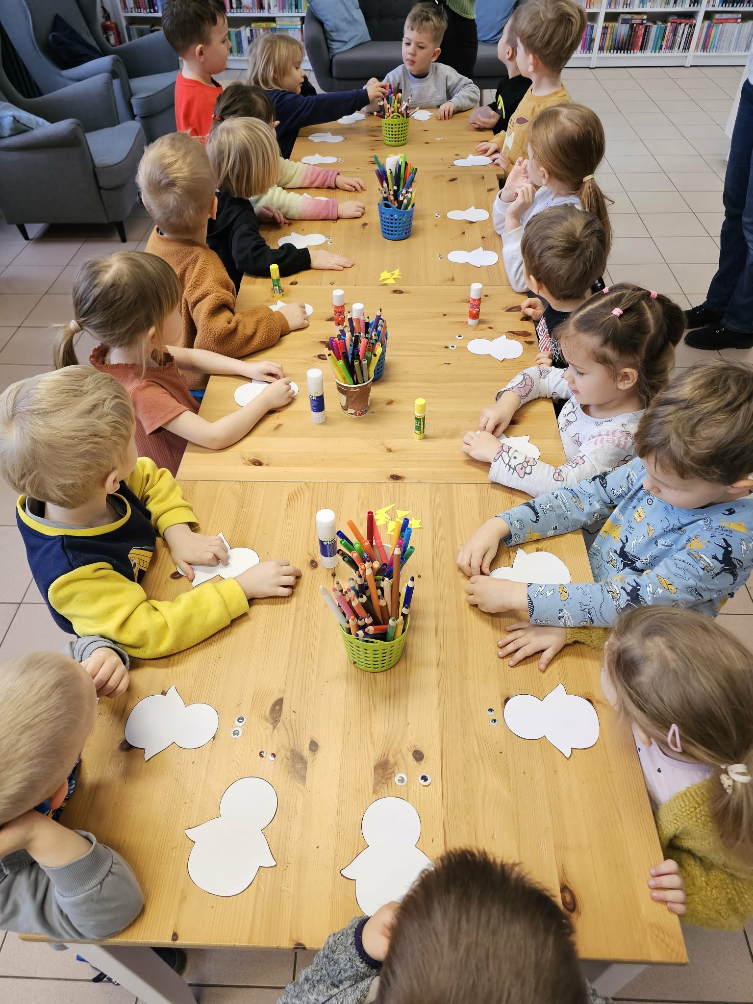 Dzieci z ogromnym zainteresowaniem wysłuchały opowieści o zimowych perypetiach Kici Koci, którą przeczytała nam Pani Bibliotekarka. Rozmawialiśmy o oznakach zimy, zimowych zabawach i o tym, jak należy się ubierać, gdy na dworze robi się chłodno. W części warsztatowej powstały urocze pingwiny – każde dziecko stworzyło swoją własną, wyjątkową pracę, ćwicząc przy tym sprawność manualną i kreatywność.
