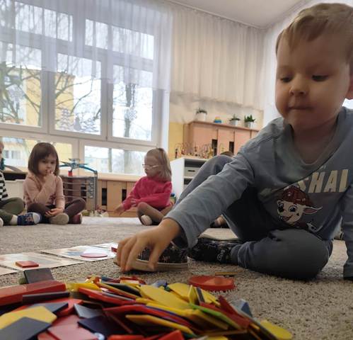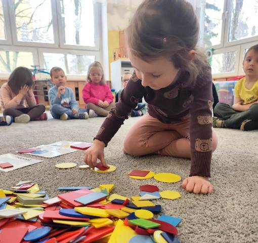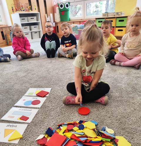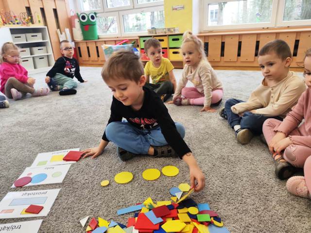 Dzisiaj bawiliśmy się figurami geometrycznymi. Szukaliśmy figur o określonych kolorach, kształtach, wielkości. Uczyliśmy się uważnego słuchania poleceń nauczyciela. Niby takie proste, a jednak wielu z nas popełniało błędy.