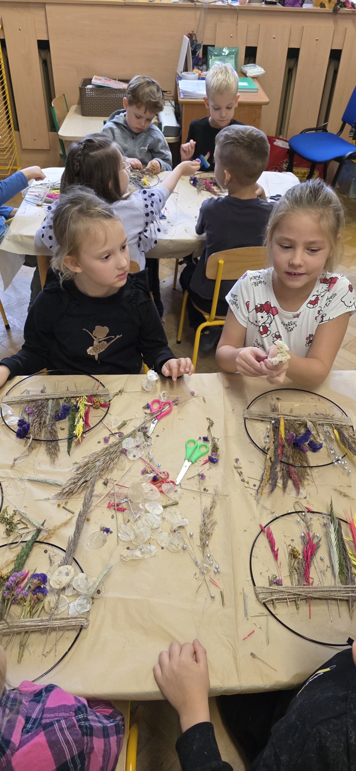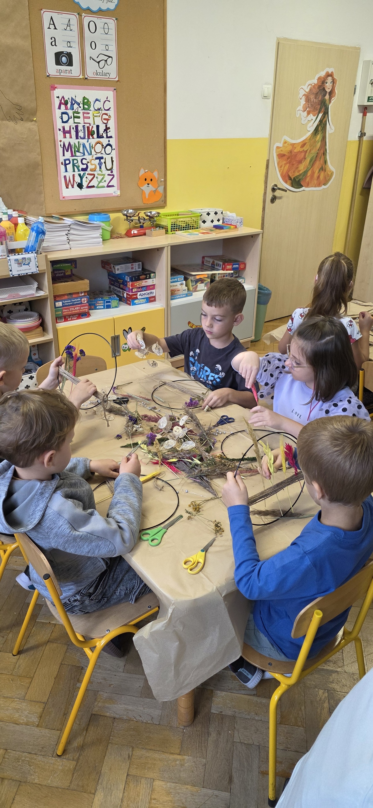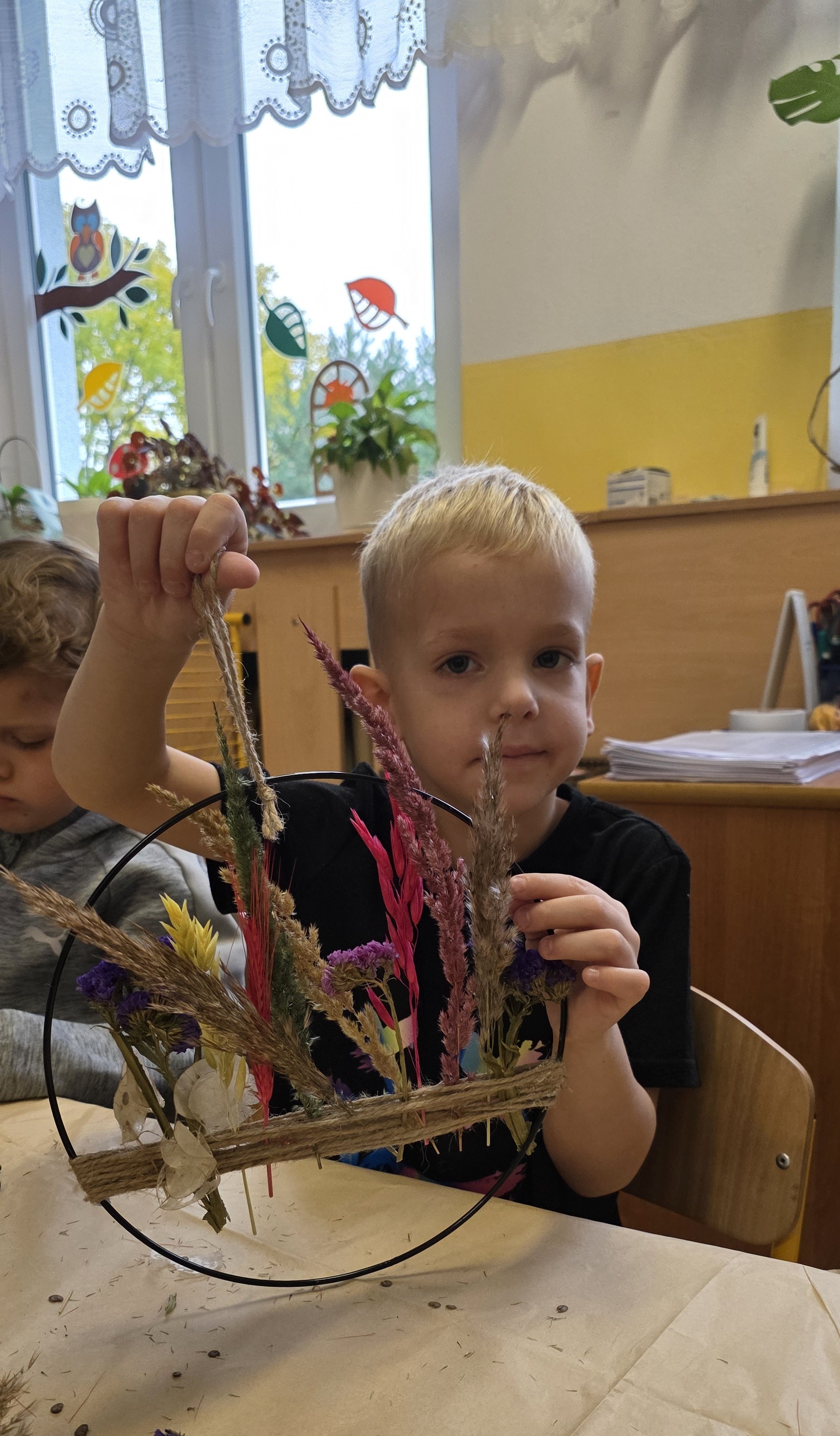 Rozpoczęliśmy regularną współpracę z Pracownią Inwencji Twórczej, miejscem stworzonym dla dzieci, które oferuje warsztaty kreatywne, kulinarne oraz chemiczne. Raz w miesiącu odwiedzać nas będzie Pani Kasia z ciekawymi warsztatami, które mamy nadzieję - zapamiętamy na długo. W dniu dzisiejszym wykonaliśmy piękną kompozycję z elementami suszu na kole - dekorację do powieszenia w domu.