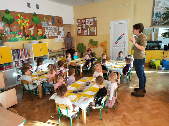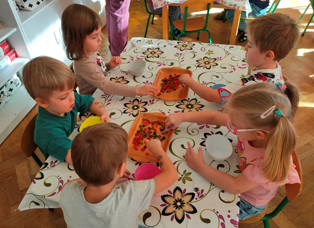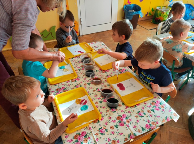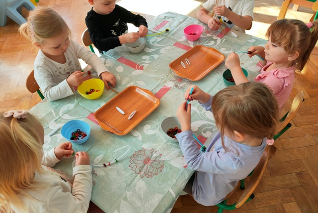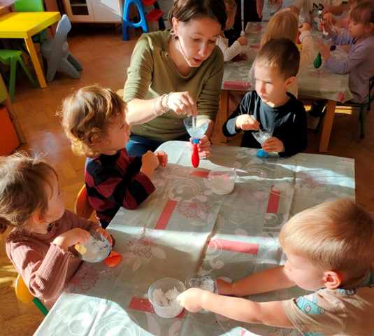 Wszystko zaczęło się bardzo niewinnie. Zasiedliśmy do stolików na których znajdowały się kartoniki z konturami drzewa pokryte dziwnym proszkiem- sodą . Pobierając pipetą barwnik malowaliśmy koronę drzewa. Później za pomocą pęsety przenosiliśmy koraliki do miseczek, które nawlekaliśmy na druciki kreatywne. Kulminacyjnym punktem zabawy okazało się tworzenie kolorowych gniotków.