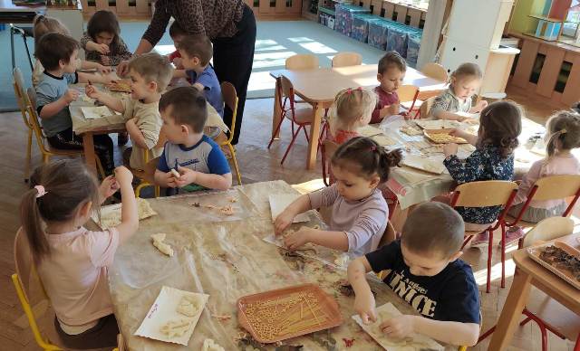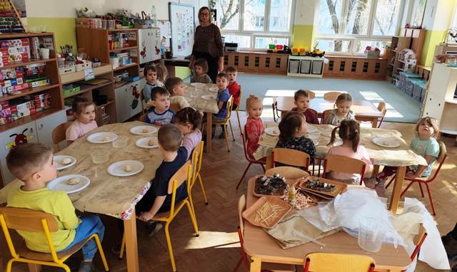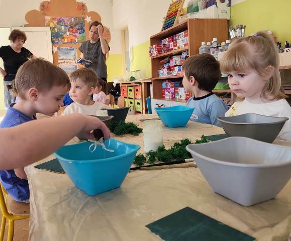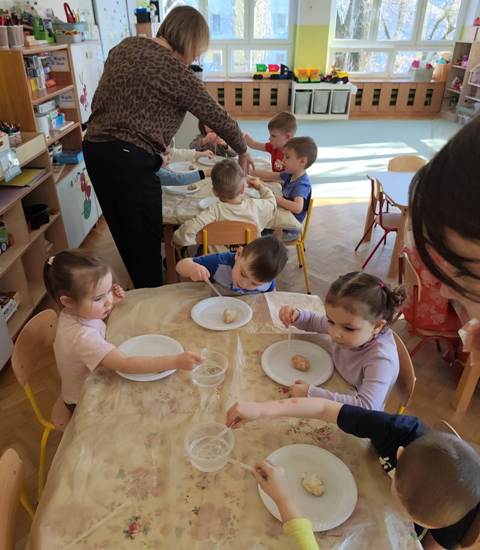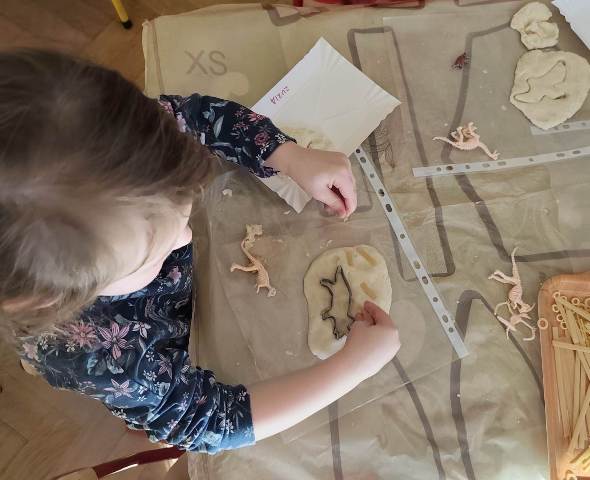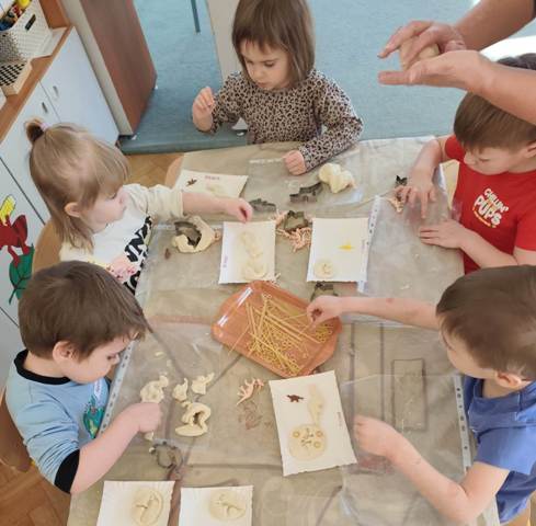 Masa na talerzykach rozpuściła się pod wpływam wody z octem aplikowanej za pomocą pipety. Wszystkim ukazały się małe, kolorowe dinozaury- zagadka została rozwiązana. Potem w innej masie plastycznej odciskaliśmy szkielety dinozaurów tworząc skamieliny, wycinaliśmy foremkami wybrane przez nas dinusie, oraz ozdabialiśmy je makaronem. Stworzyliśmy również makietę miejsca w którym będzie mógł zamieszkać nasz nowy przyjaciel.