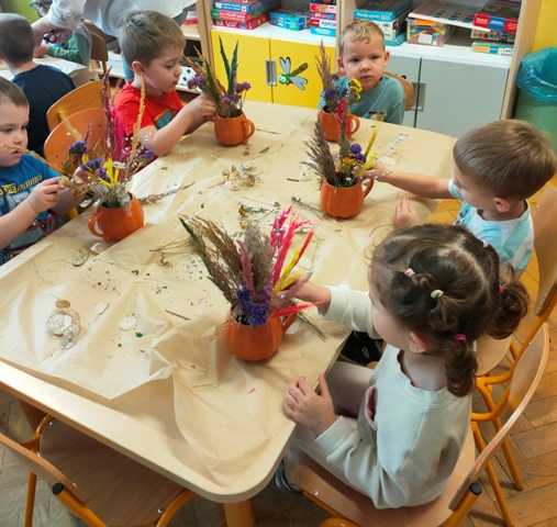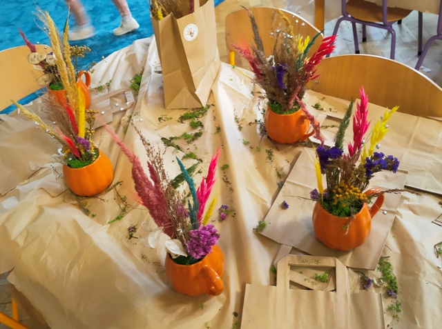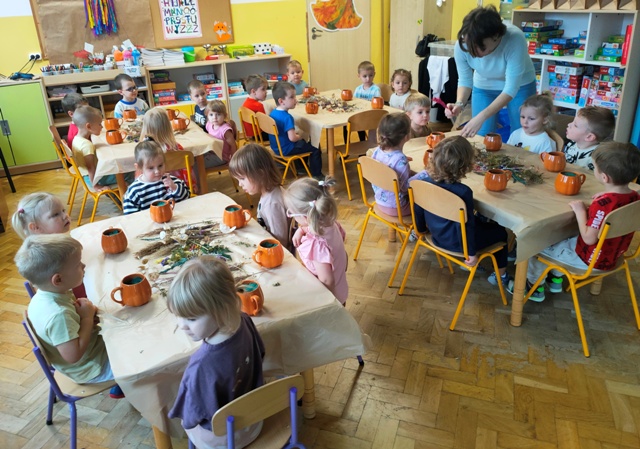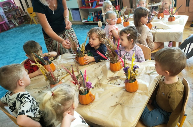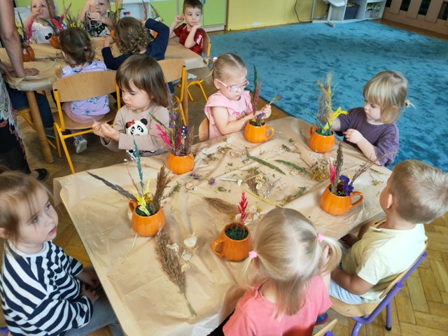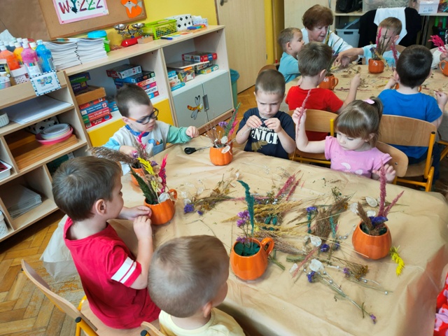 Dzisiaj tworzyliśmy jesienne bukiety florystyczne umieszczane w ceramicznych naczyniach w kształcie dyni. Poznawaliśmy strukturę różnych suszonych roślin- były miękkie i puszyste pióropusze traw, ostre kłosy zbóż, delikatne i kruche kwiaty zatrwianu, delikatne kępki zielonego mchu, a także krucha gąbka florystyczna. Nasze rączki pracowały z wielkim zapałem, a efekty ich działań będziecie mogli sami ocenić, gdy spotkamy się po podwieczorku w przedszkolnej szatni.