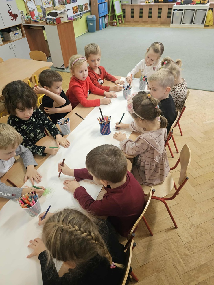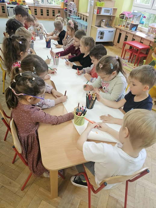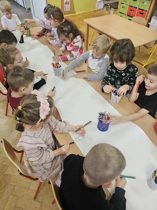 Następnie każde dziecko miało za zadanie przygotować jedno lub kilka drzew owocowych – wykorzystując farby, kolorowy papier, bibułę, plastelinę i inne materiały plastyczne. Było dużo wycinania, wyklejania i odciskania paluszków zamoczonych w farbie – dzięki czemu powstały kolorowe jabłka, gruszki i śliwki.