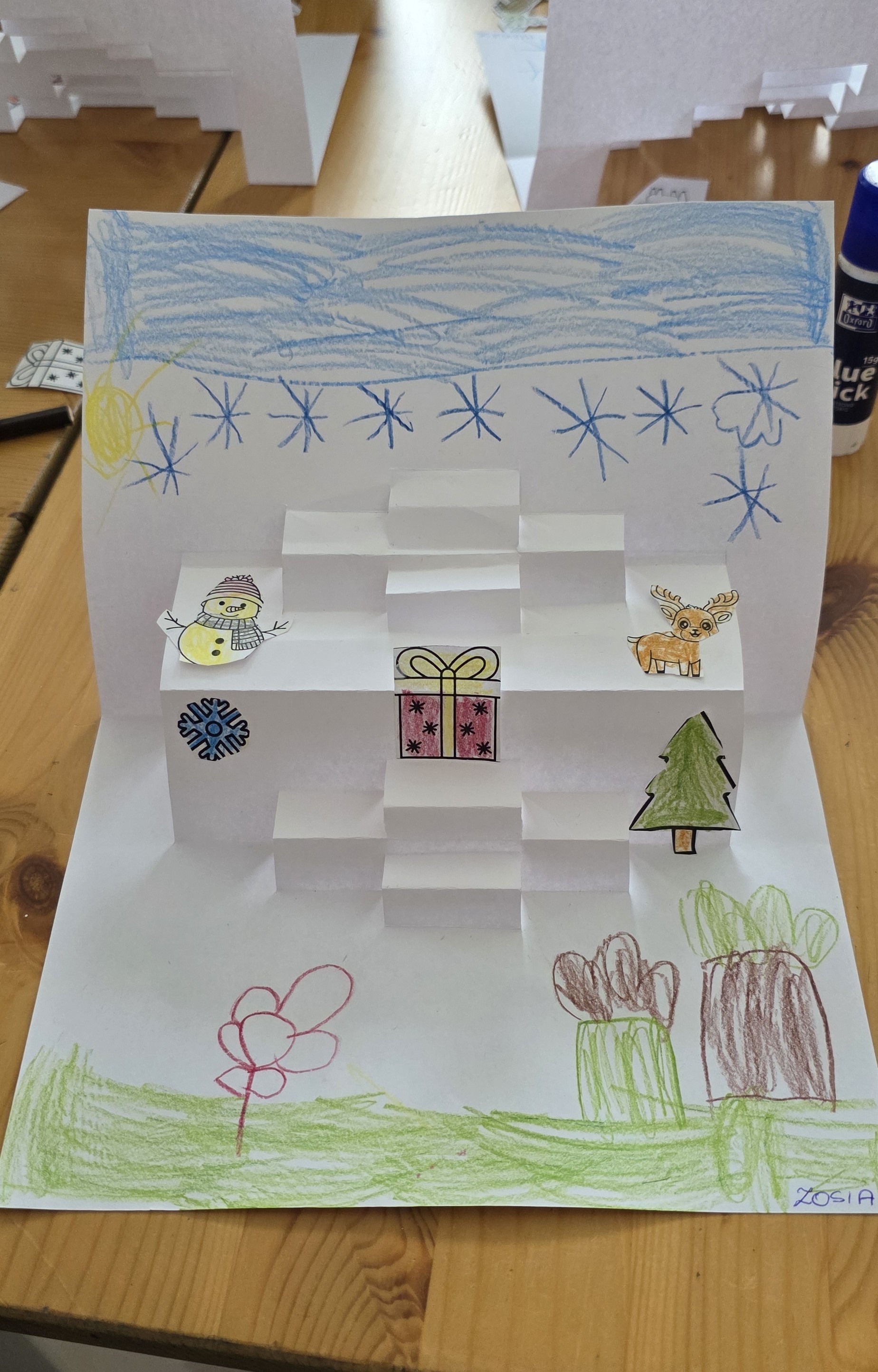 Dzisiaj uczestniczyliśmy w zajęciach w Bibliotece Miejskiej TRAF. Wysłuchaliśmy książki „Fajny Cieciorek i prezent wszechczasów”, dzięki której uświadomiliśmy sobie, że prezent to nie tylko ten kupiony w sklepie, ale również ten wykonany własnoręcznie - stworzony z sercem, pomysłem i myślą o drugiej osobie. Następnie wykonaliśmy świąteczne kartki z efektem 3D Pop-up.