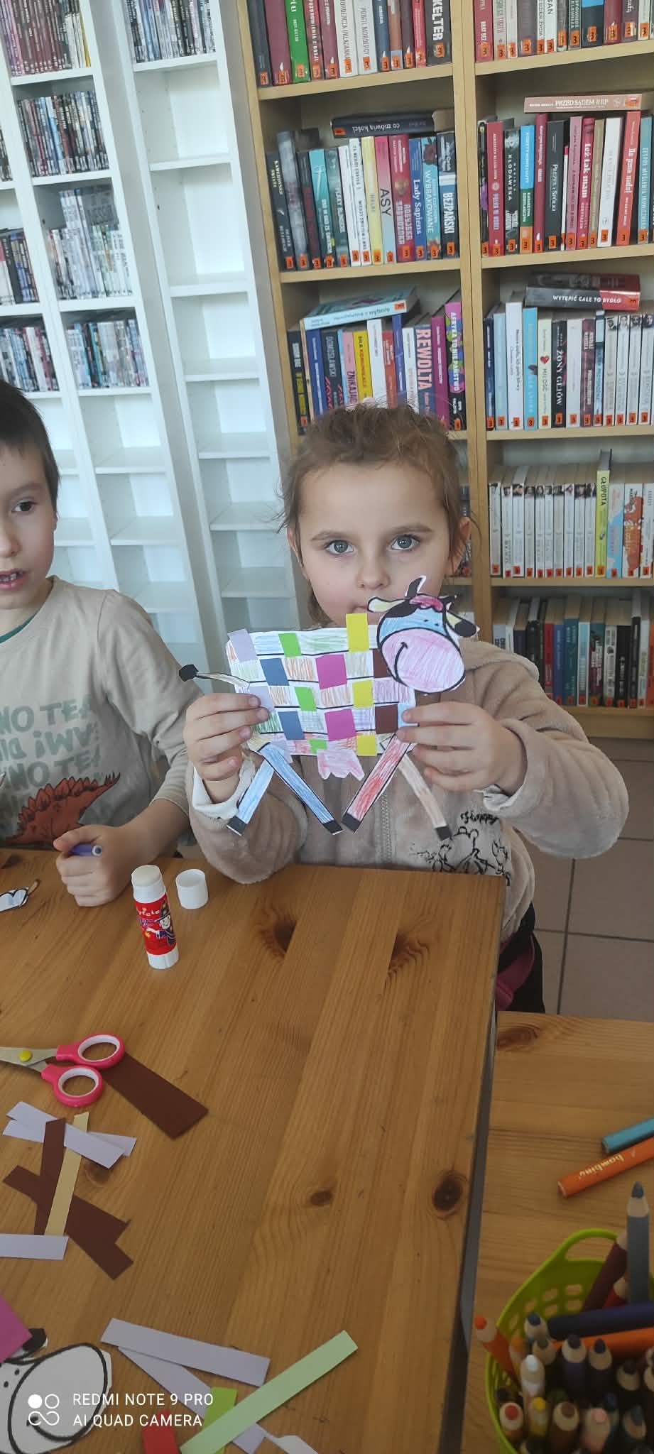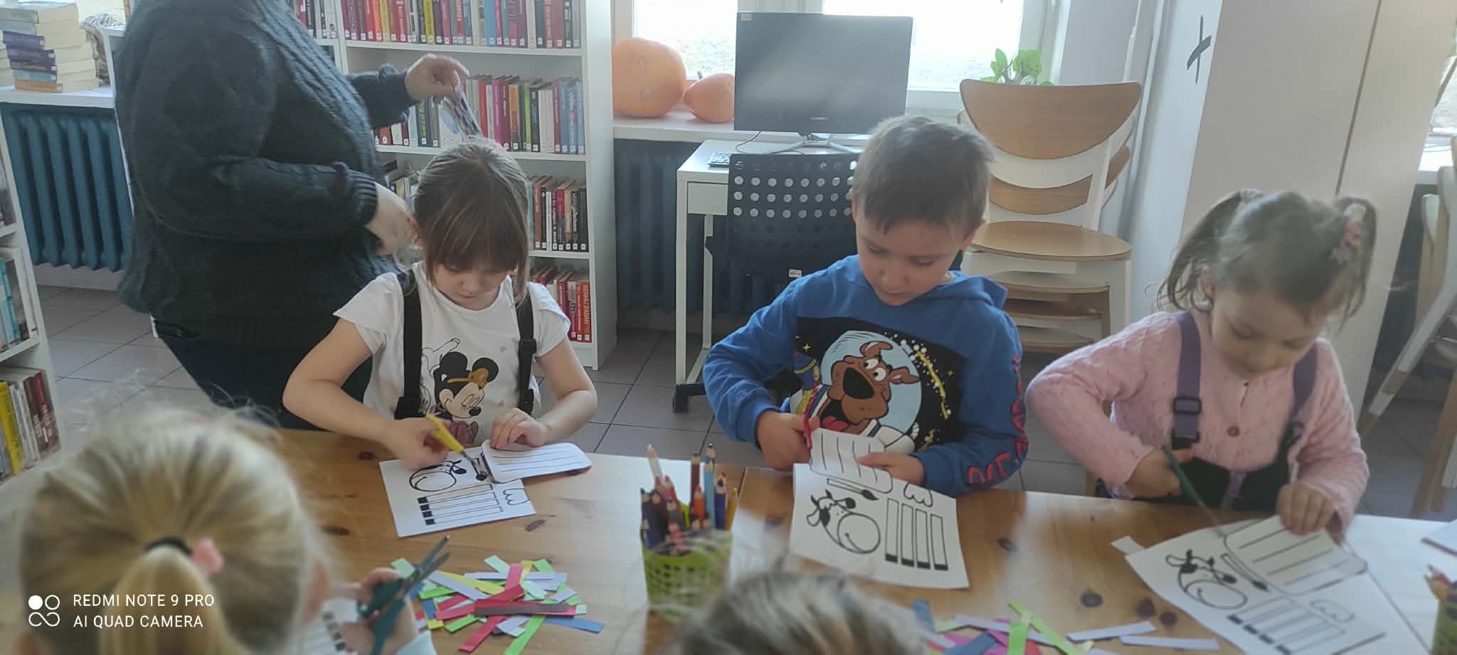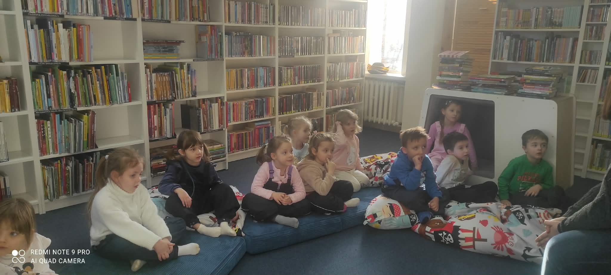 Biedronki uczestniczyły w zajęciach w Bibliotece Miejskiej TRAF. Po wysłuchaniu opowiadania dzieci aktywnie uczestniczyły w rozmowie na temat treści książki, bohaterów oraz wydarzeń. Następnie wykonały pracę plastyczną z wyciętych samodzielnie elementów.