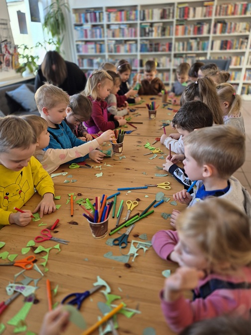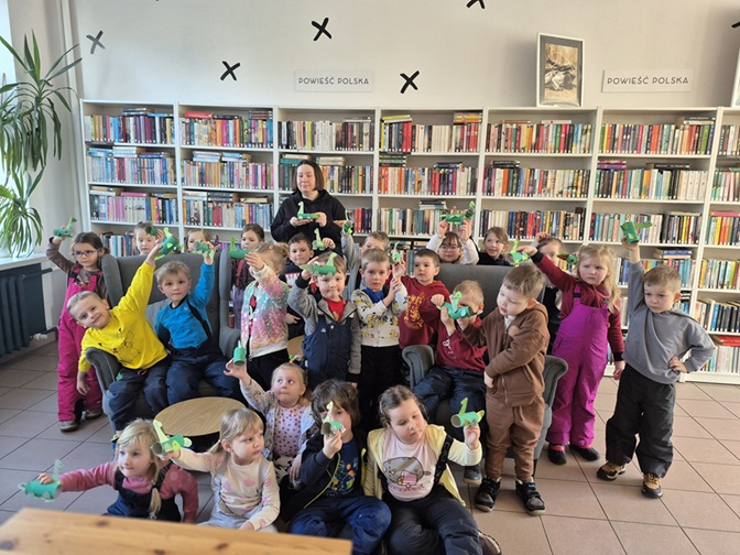 Po części czytelniczej dzieci wzięły udział w zajęciach plastycznych. Każdy przedszkolak wykonał własnego dinozaura z rolki po papierze toaletowym. Zajęcia przebiegały w radosnej atmosferze, łącząc naukę z zabawą i twórczym działaniem.