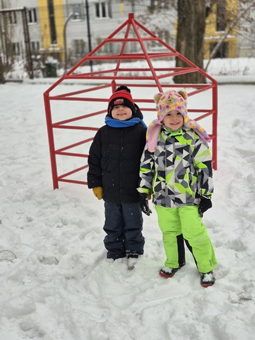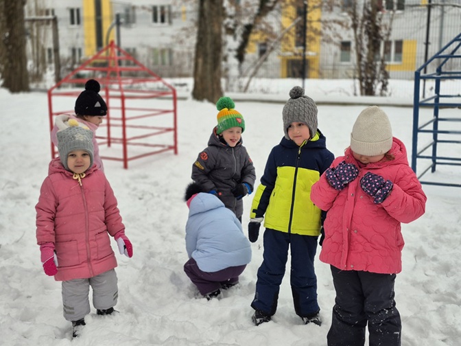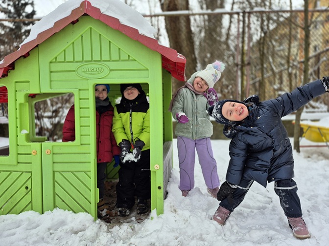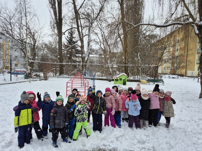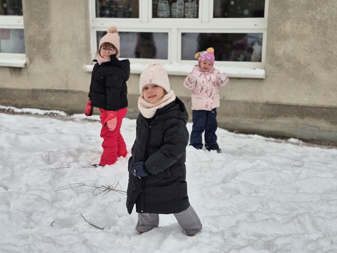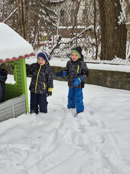 Dzieci bawią się w ogrodzie przedszkolnym na śniegu, lepią bałwany, rzucają się śnieżkami, i odkrywają uroki zimowej zabawy. Cieszą się ruchem na świeżym powietrzu, śmieją się i spędzają czas w radosnej, zimowej atmosferze.