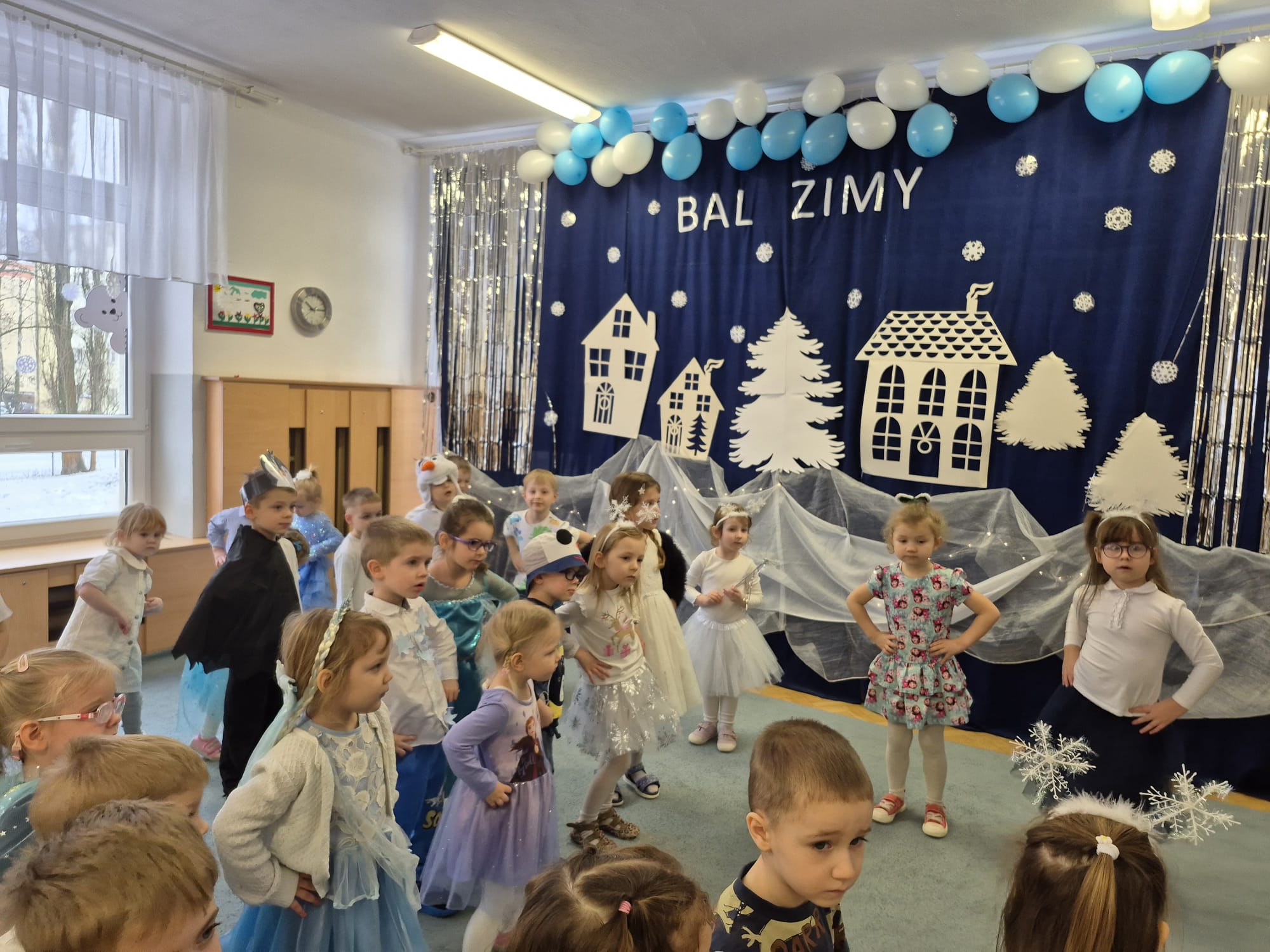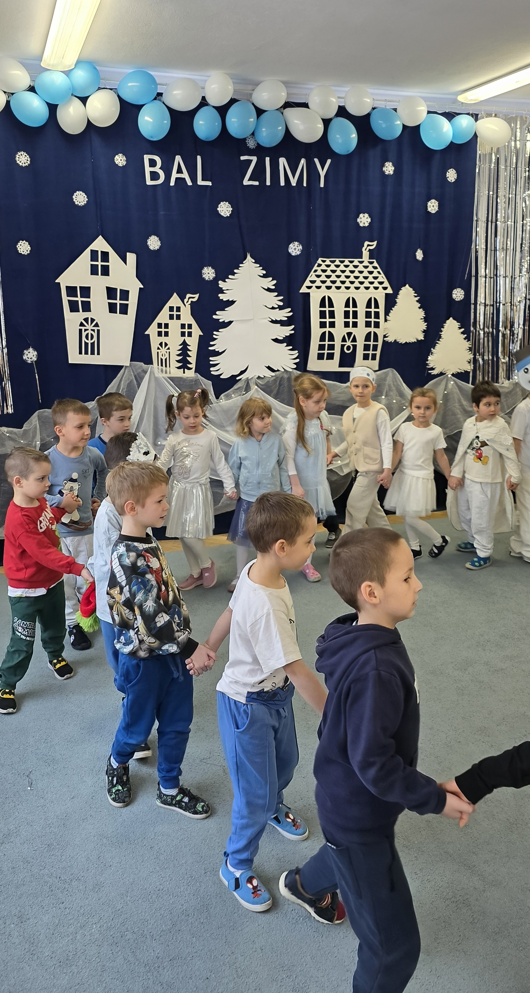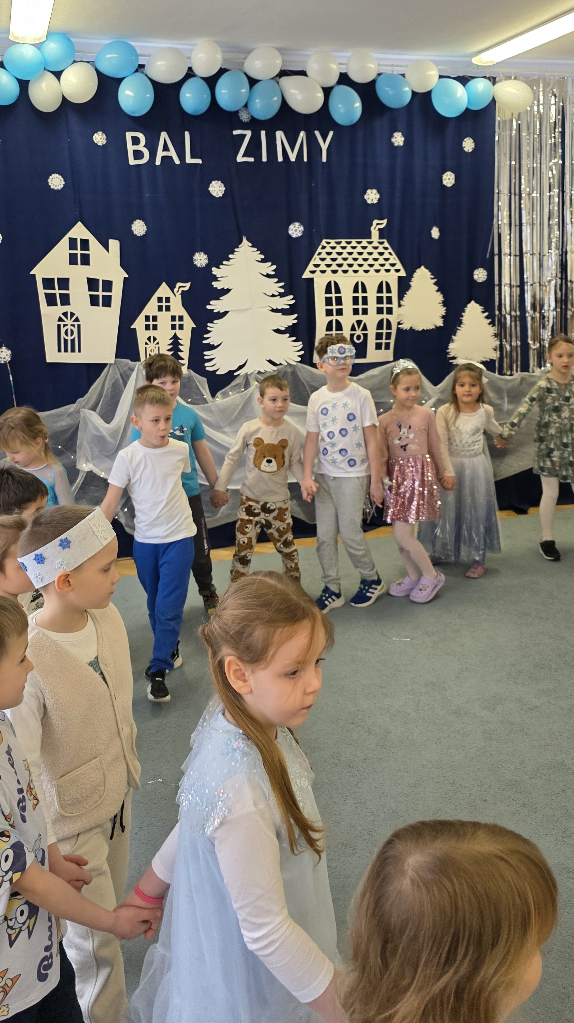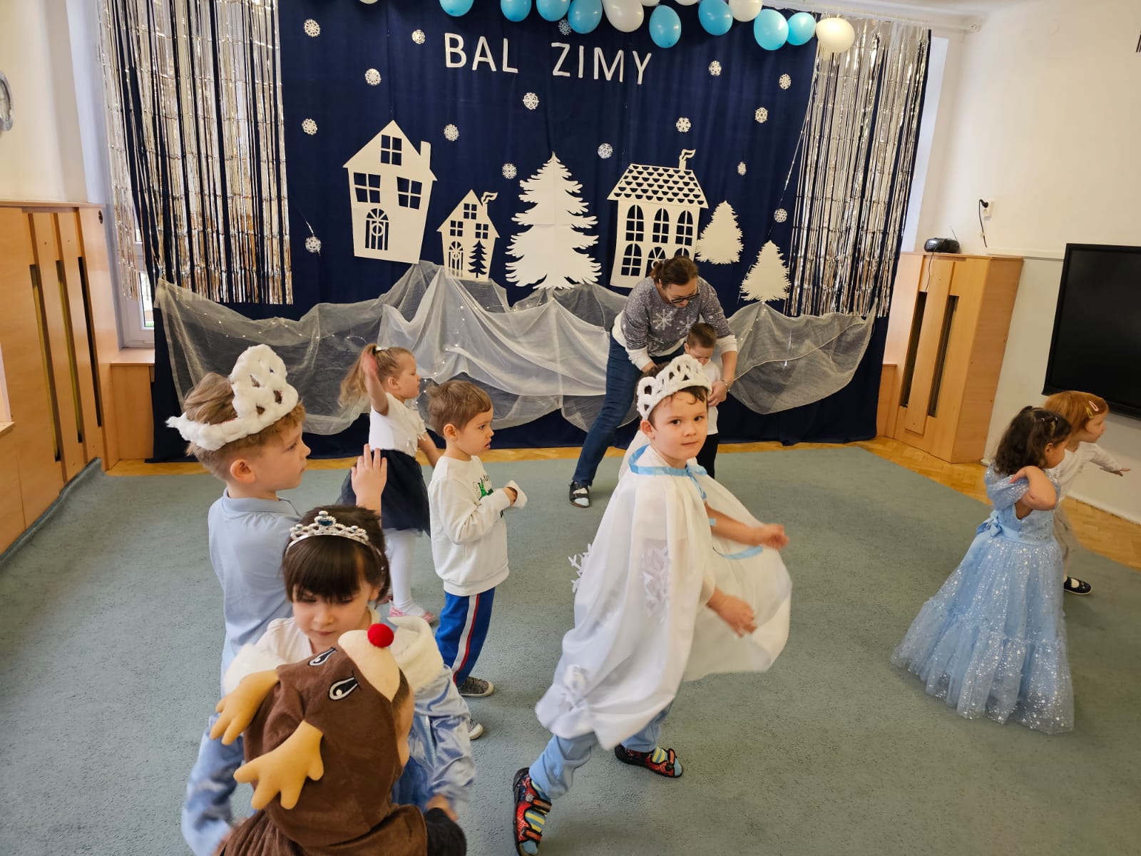 Już od rana wiało chłodem. Do przedszkola przybyła Królowa Zima i zabrała wszystkich na bal do swojej krainy. Dzieci ubrane w biało-niebieskie kolory bawiły się i tańczyły przy znanych i wesołych piosenkach z repertuaru zimowego. Wszystkiemu towarzyszył głośny śmiech i radość z wspólnej zabawy, nawet nie zmarzliśmy.