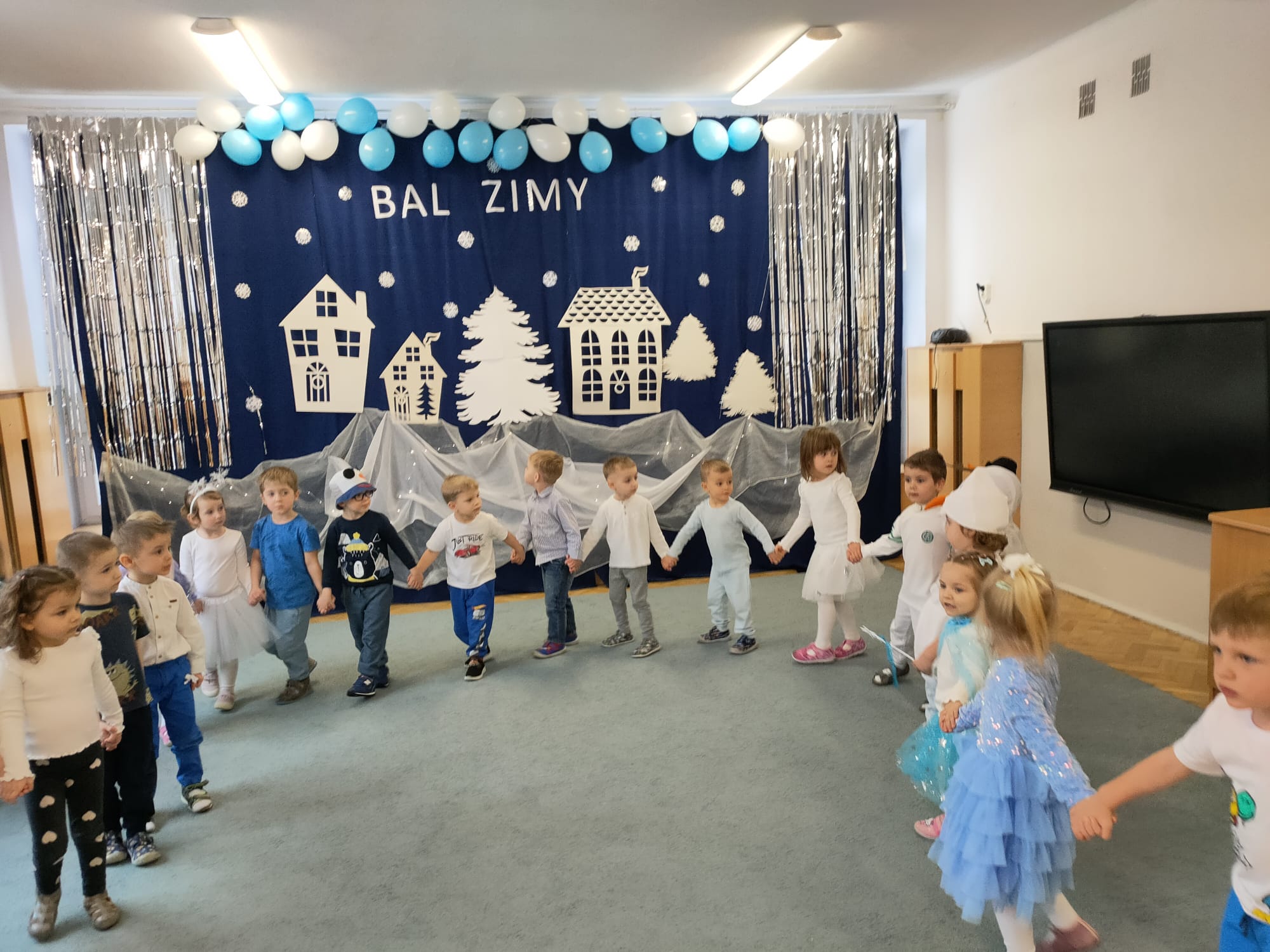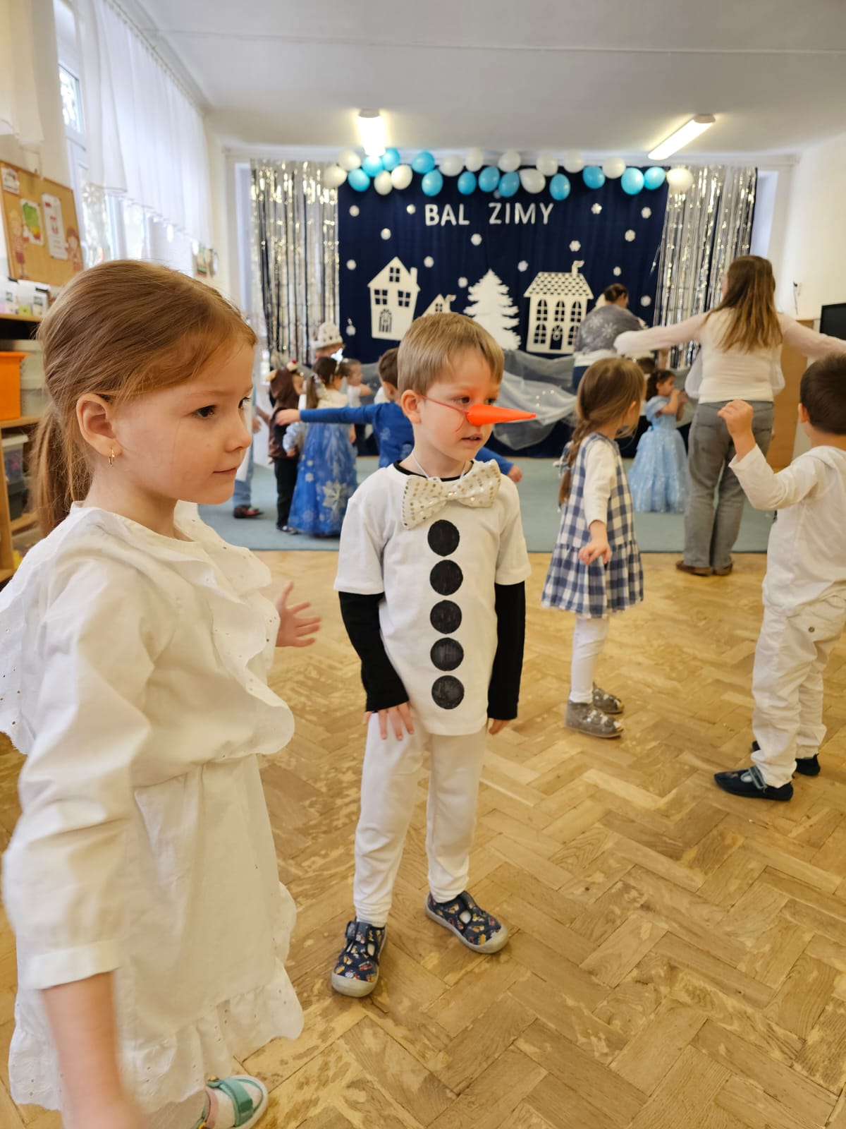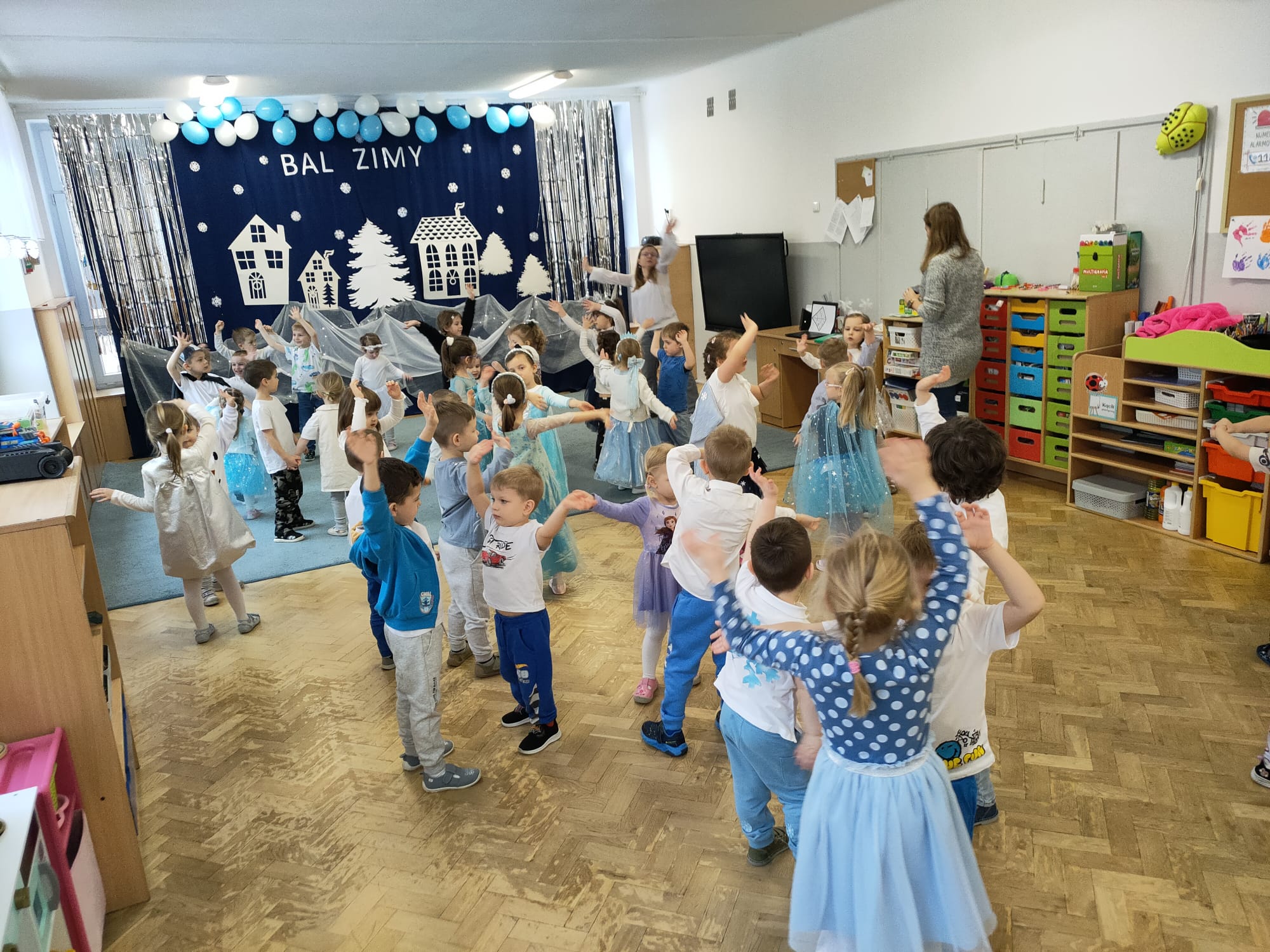Już od rana wiało chłodem. Do przedszkola przybyła Królowa Zima i zabrała wszystkich na bal do swojej krainy. Dzieci ubrane w biało-niebieskie kolory bawiły się i tańczyły przy znanych i wesołych piosenkach z repertuaru zimowego. Wszystkiemu towarzyszył głośny śmiech i radość z wspólnej zabawy, nawet nie zmarzliśmy.