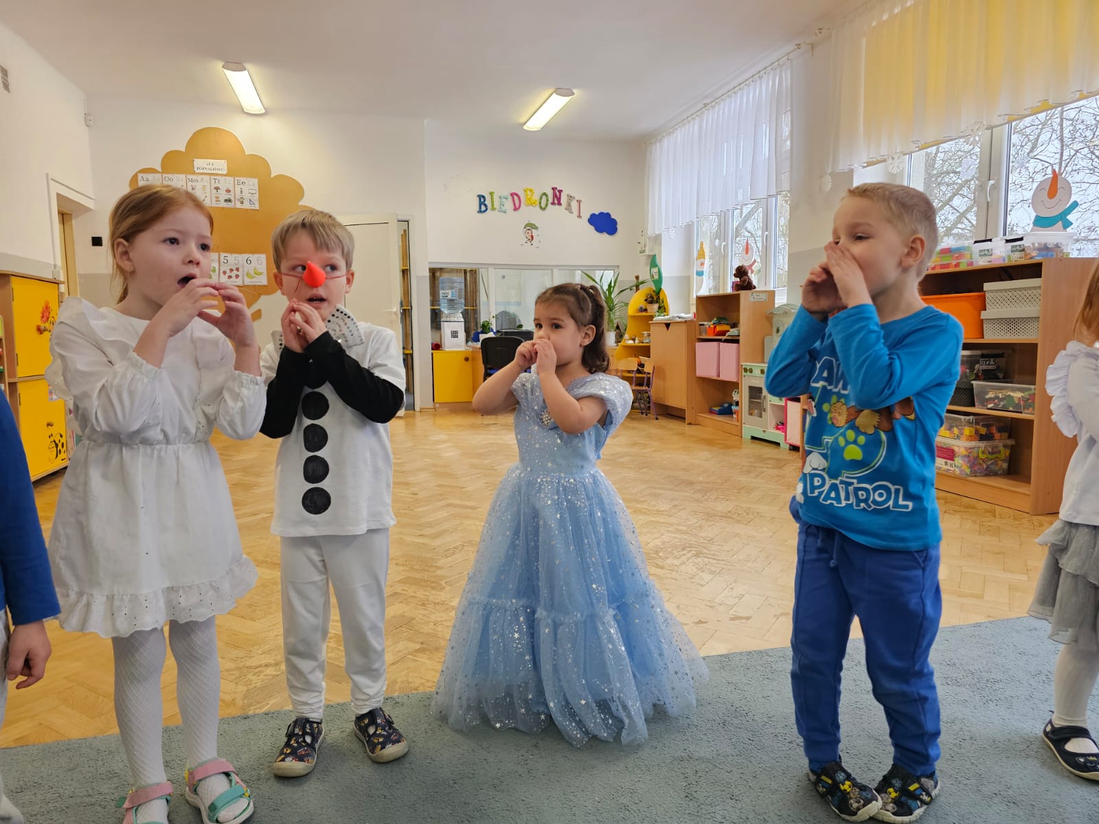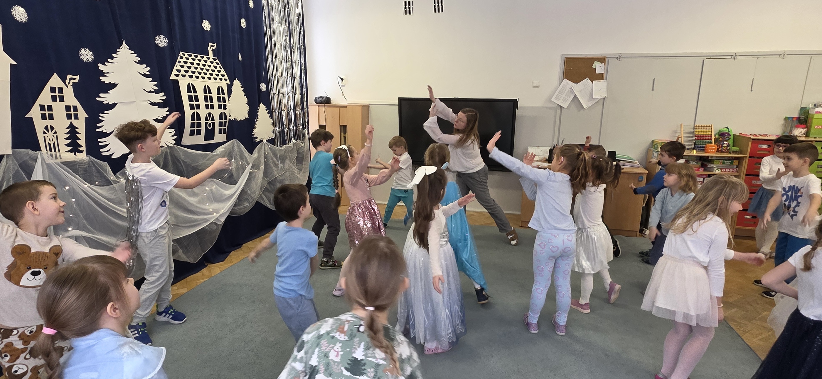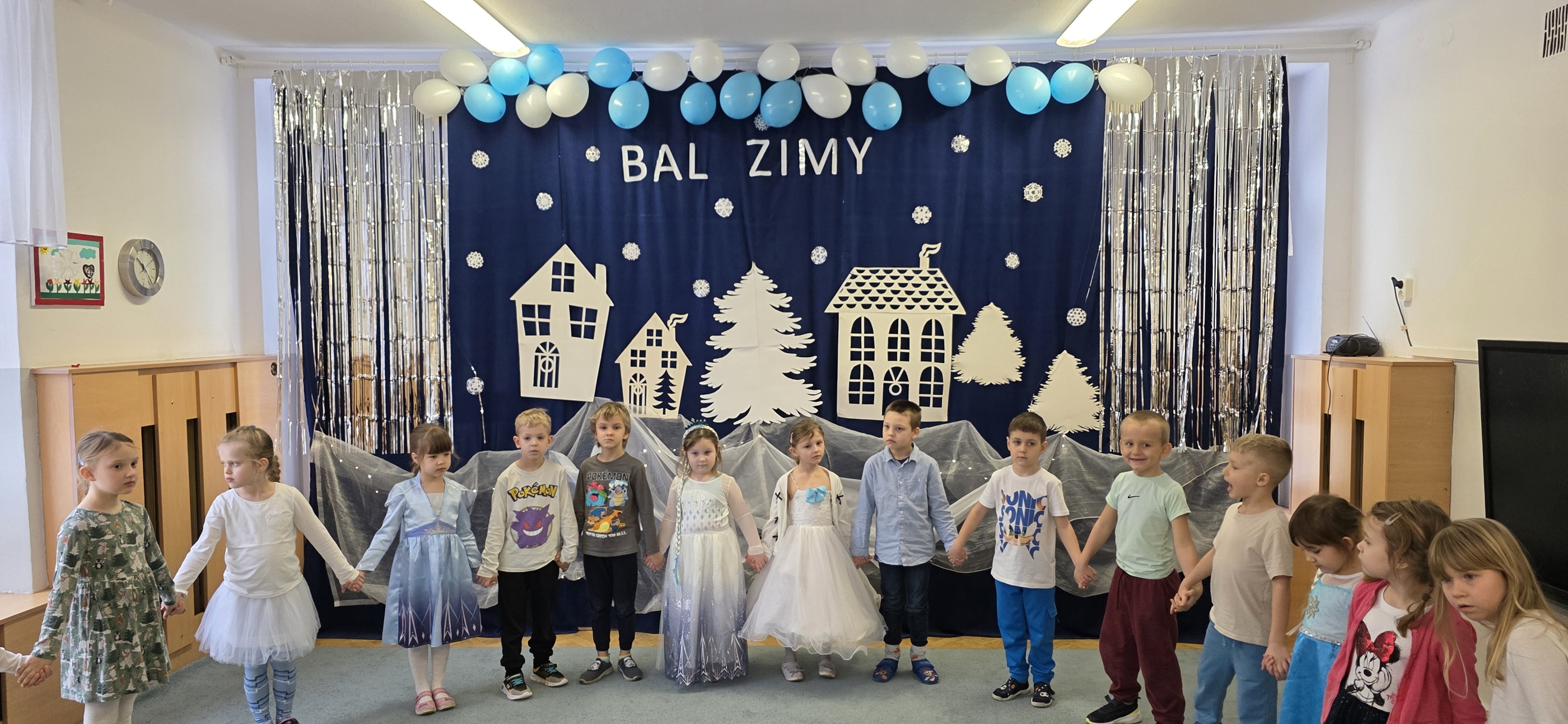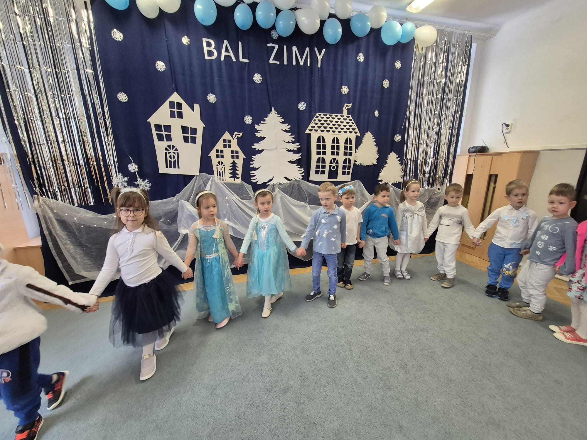 Już od rana wiało chłodem. Do przedszkola przybyła Królowa Zima i zabrała wszystkich na bal do swojej krainy. Dzieci ubrane w biało-niebieskie kolory bawiły się i tańczyły przy znanych i wesołych piosenkach z repertuaru zimowego. Wszystkiemu towarzyszył głośny śmiech i radość z wspólnej zabawy, nawet nie zmarzliśmy.